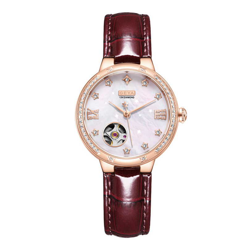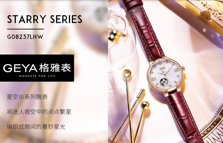 Geya/格雅手表 女士真钻机械表全自动镂空表盘G08237LHW皮带8237
