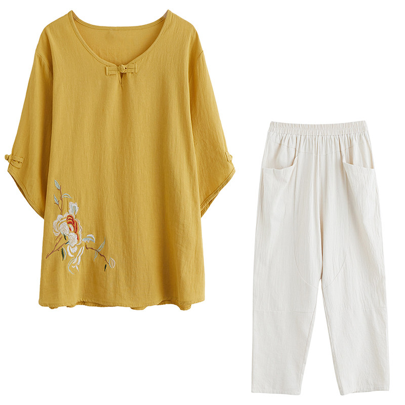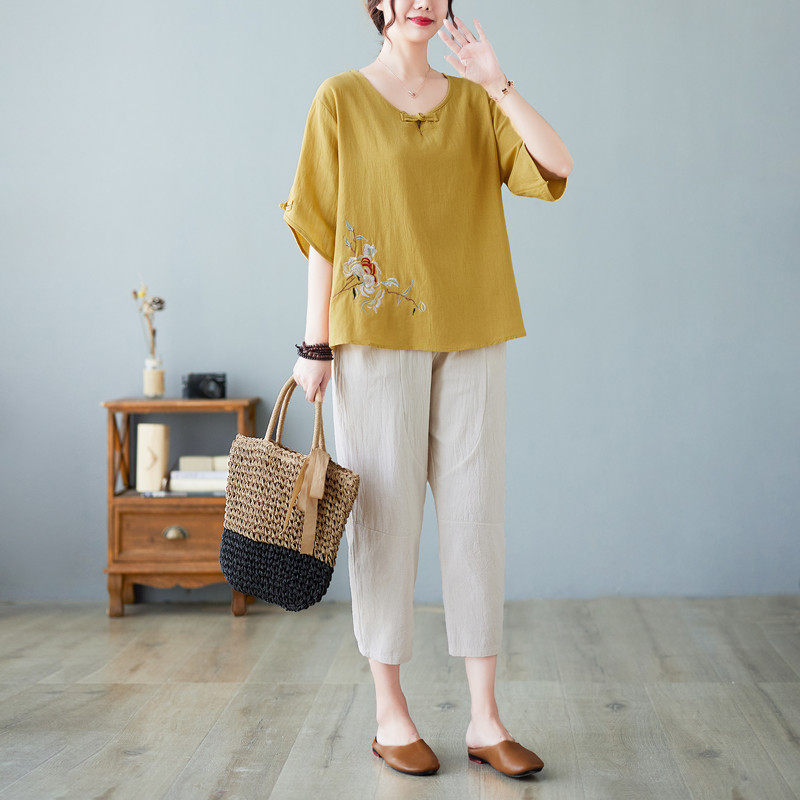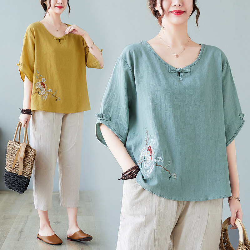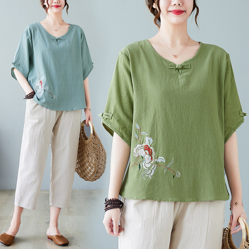 洋气棉麻上衣大码女装夏装绣花短袖T恤夏季纯棉套装中老年妈妈装