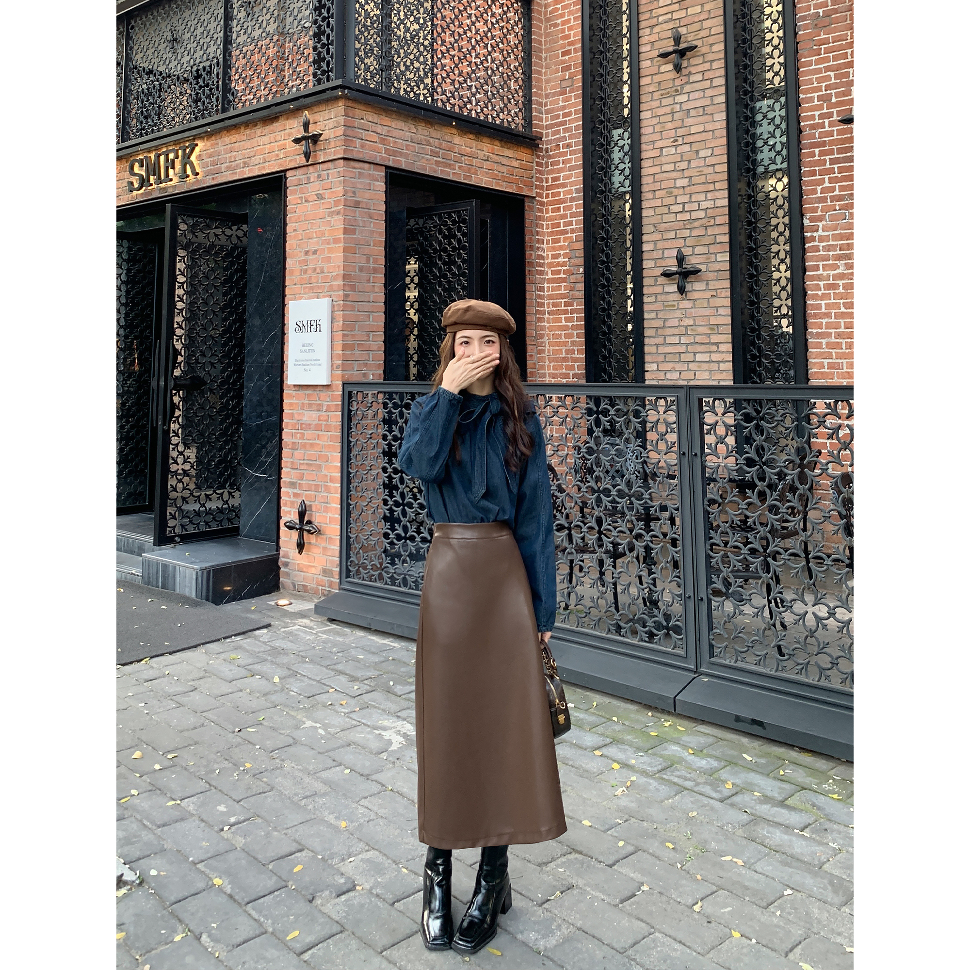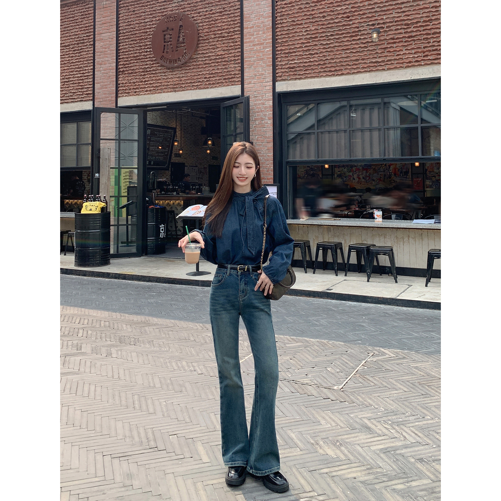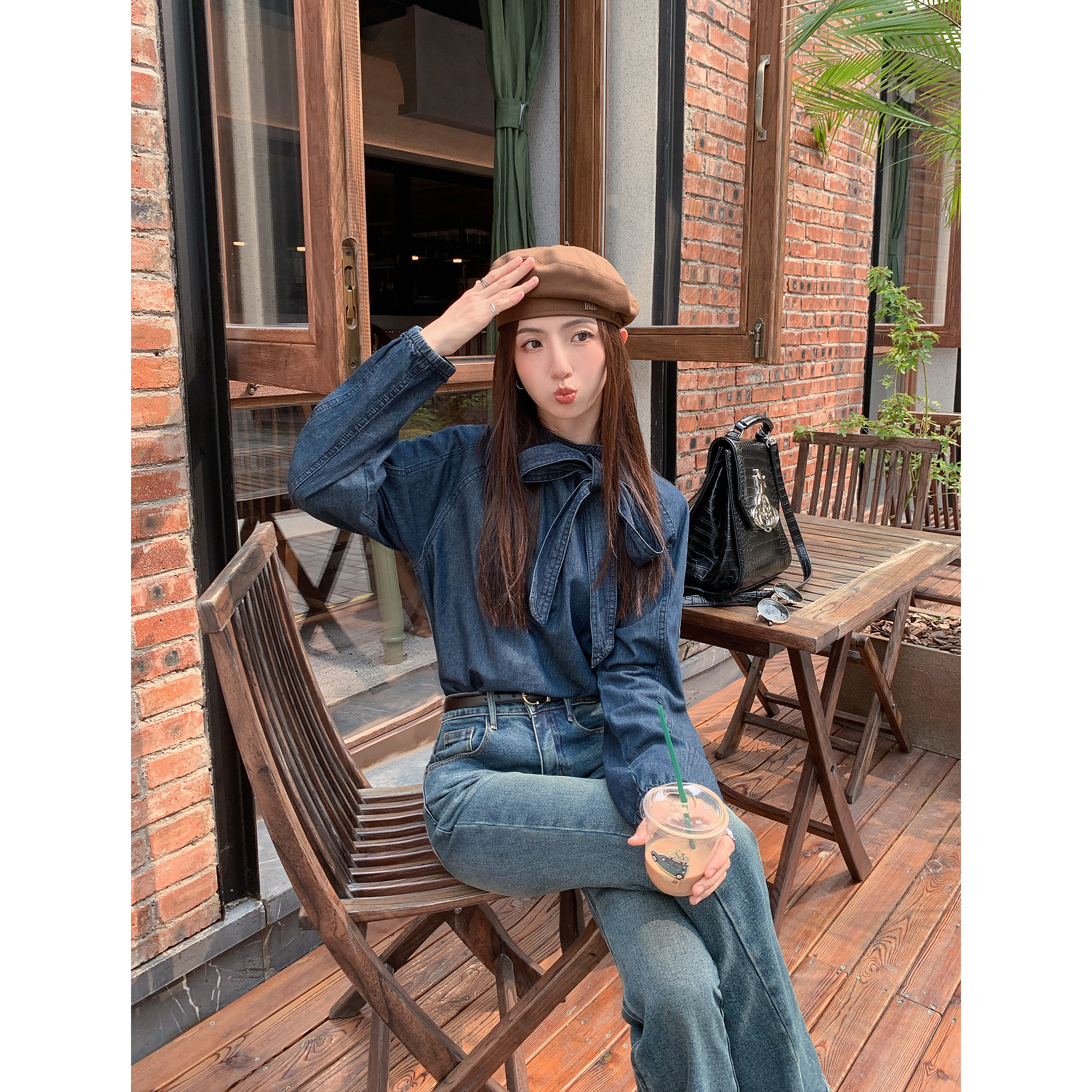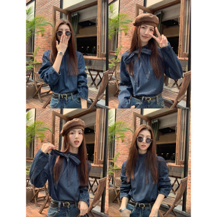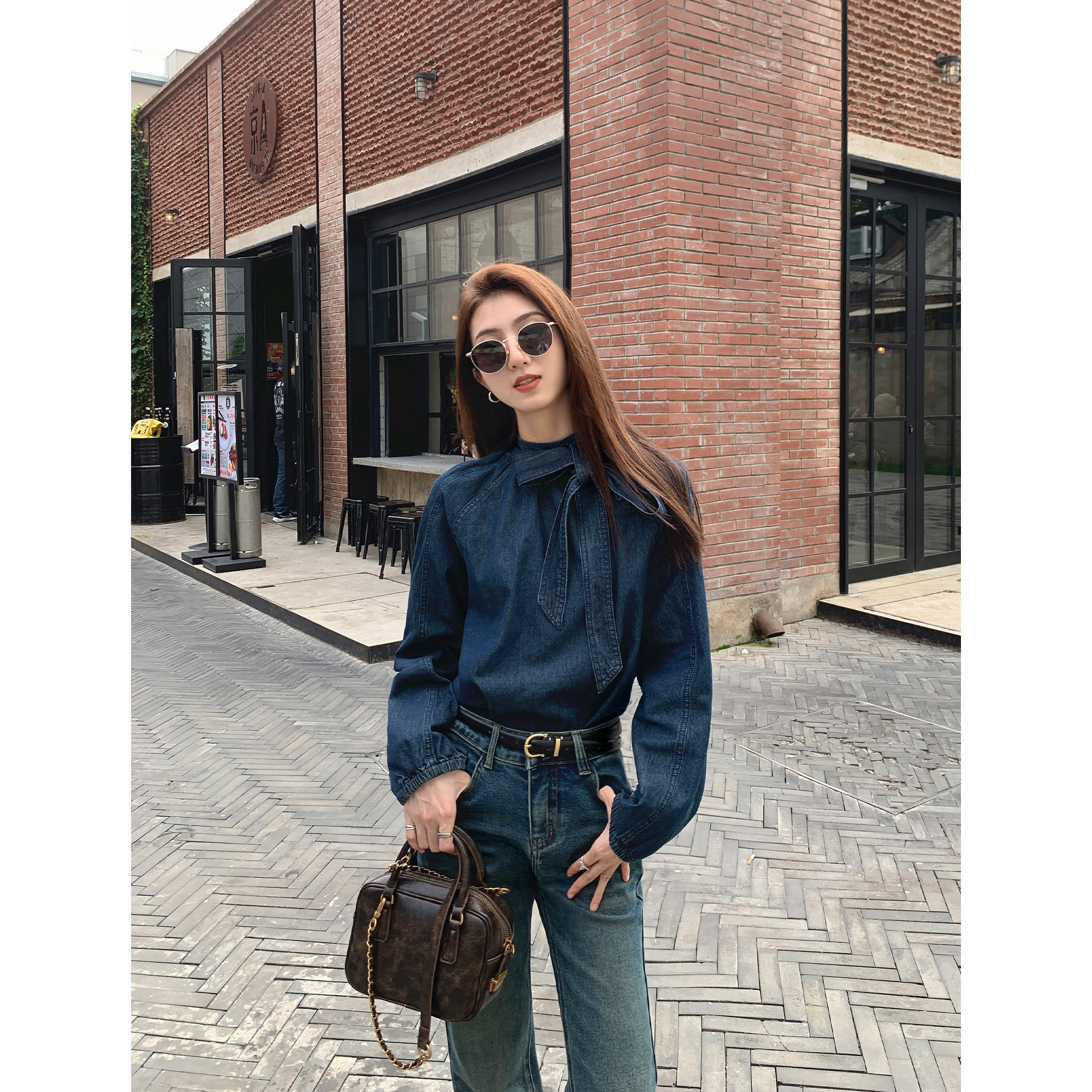 MULVAN 设计感长袖牛仔衬衫女2025秋冬新款法式复古气质系带上衣