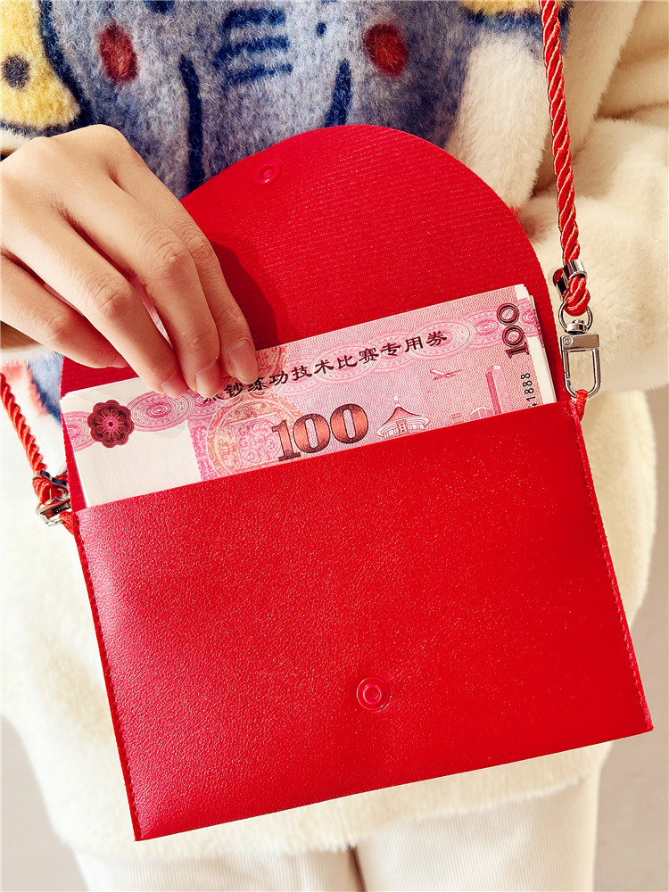 拜年可爱毛绒diy手工粘贴pu皮质横款红包袋斜跨可背带挂绳利是封