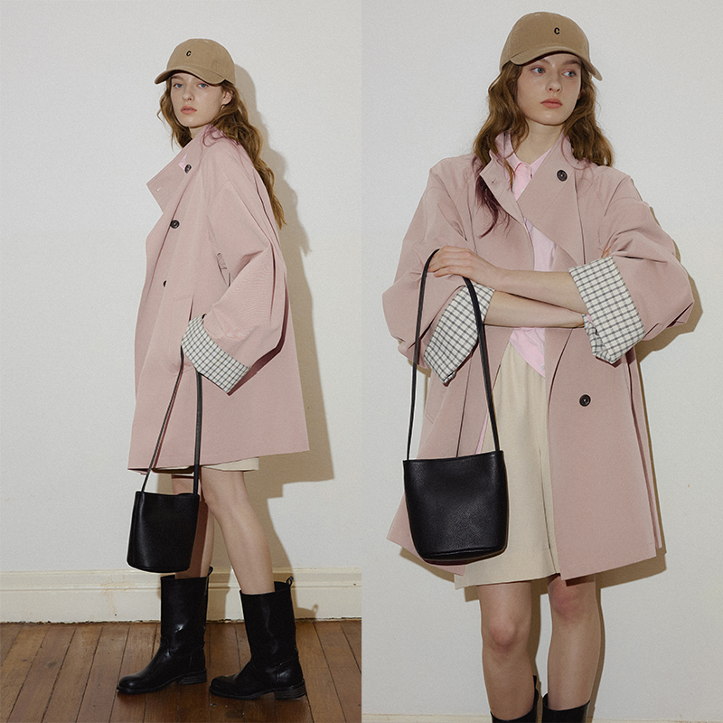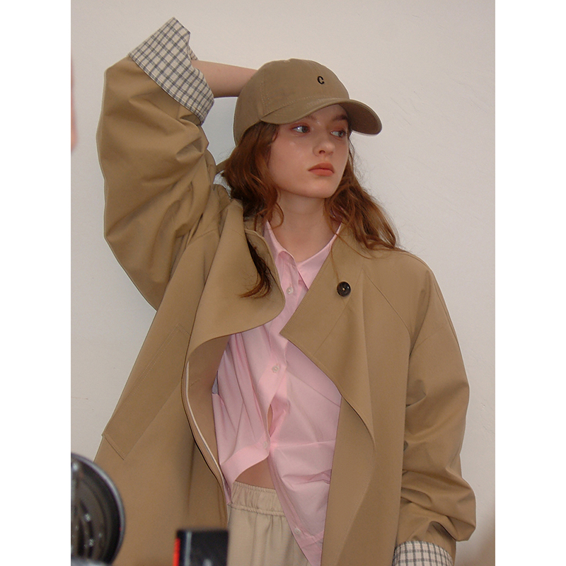 popchrio◆复古格子撞袖天丝棉立领卡其色风衣小个子短款外套女秋