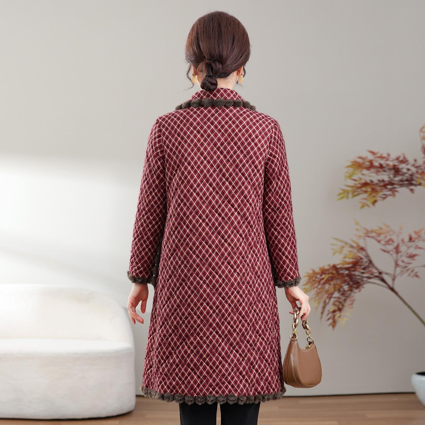 妈妈装格子冬装棉衣加绒加厚外套中老年女装中长款棉衣家居服棉袄