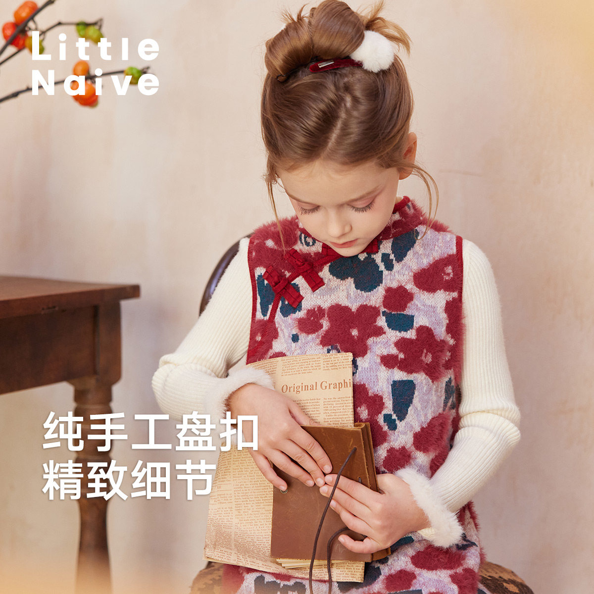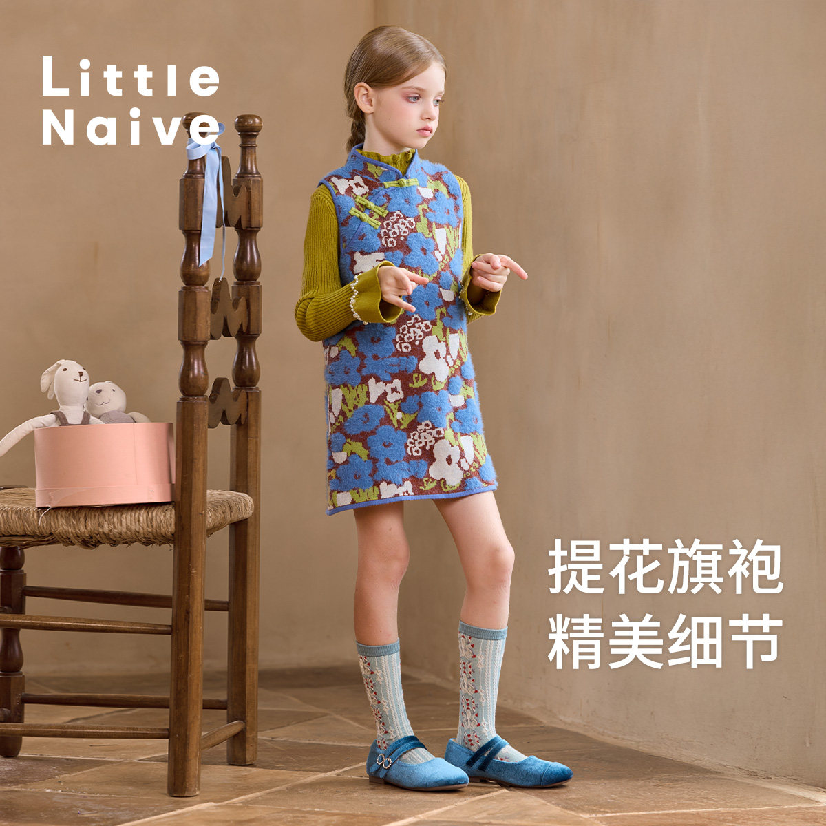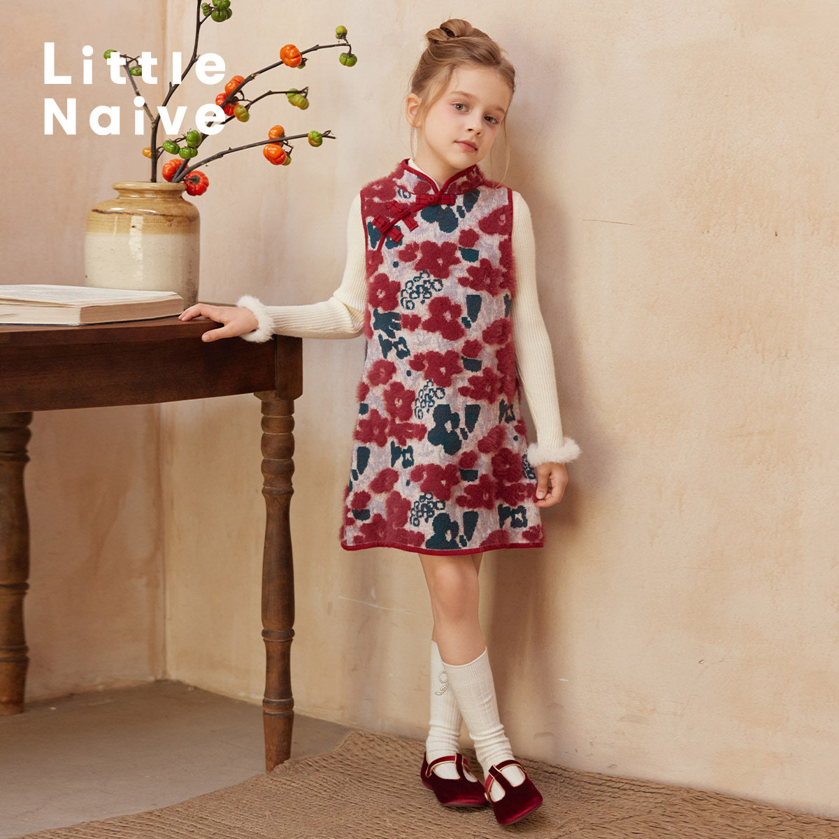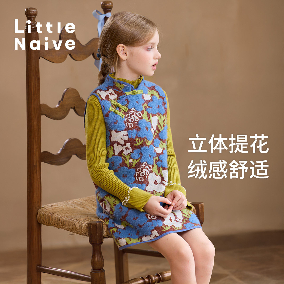 LittleNaive女童连衣裙冬季新款立领花朵背心裙儿童新中式针织裙