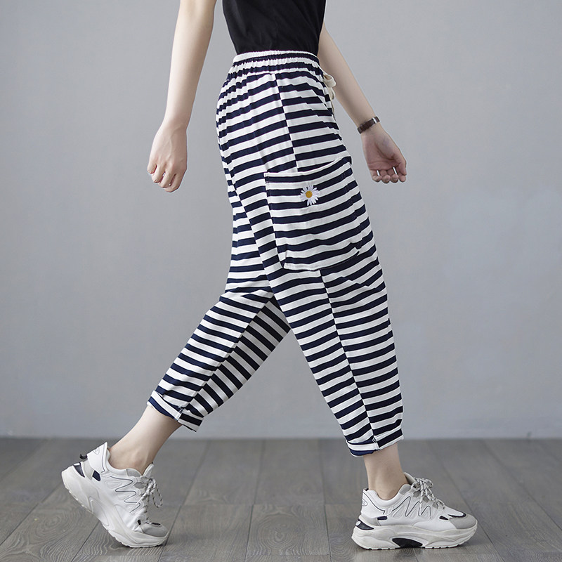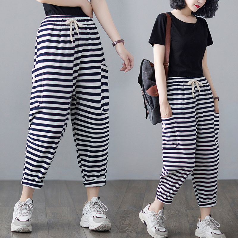 运动裤女夏季薄款宽松垂感折扣新款条纹卫裤显瘦韩版七分哈伦裤子