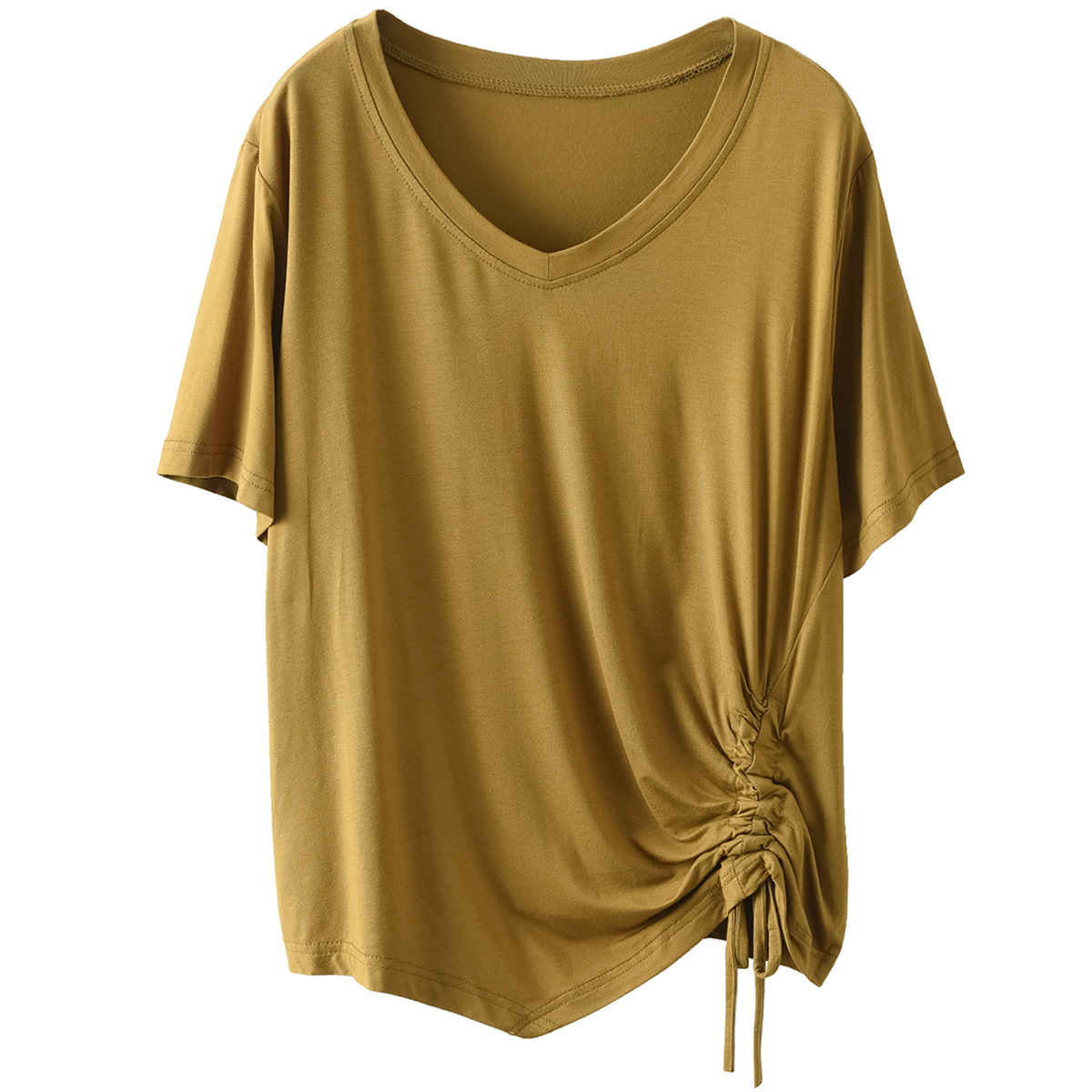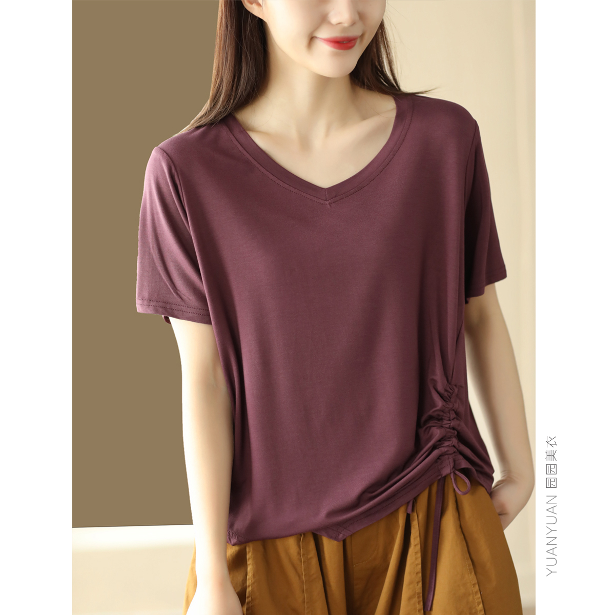 园园美衣新款时尚抽绳收褶摆短袖衫弹力百搭套头上衣休闲纯色T恤