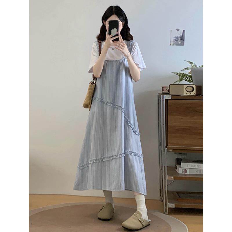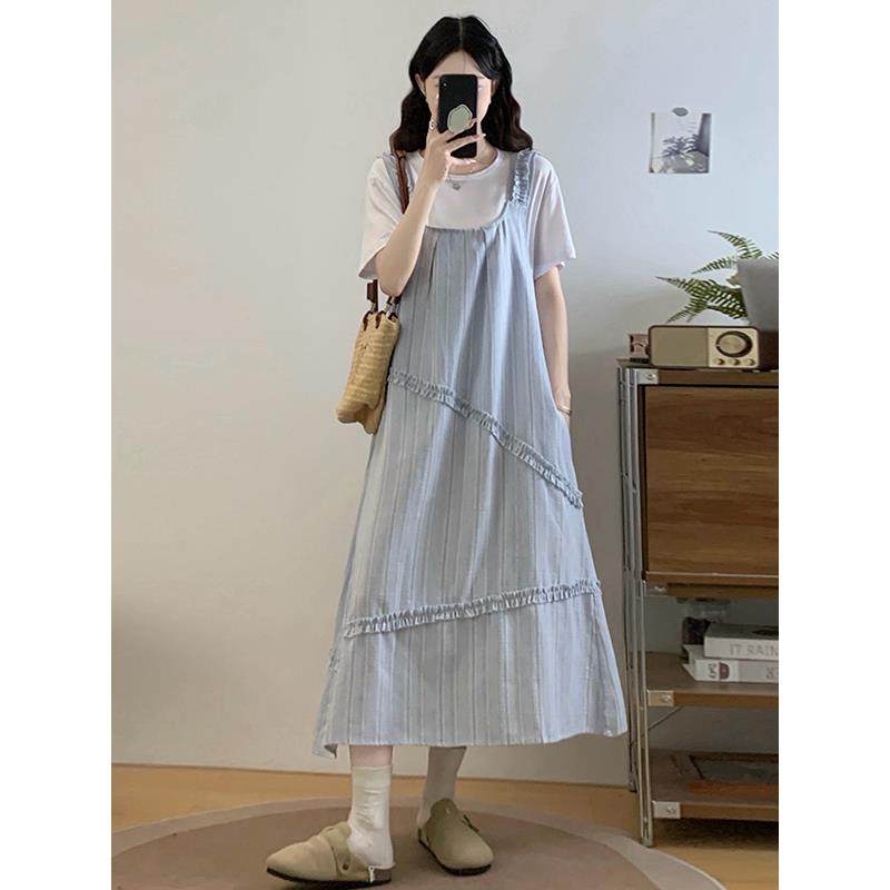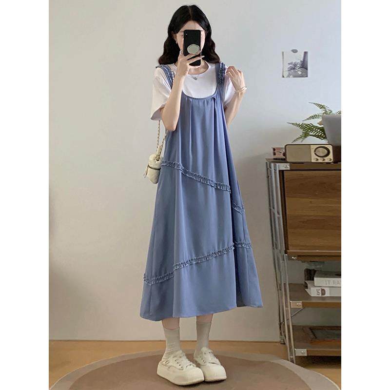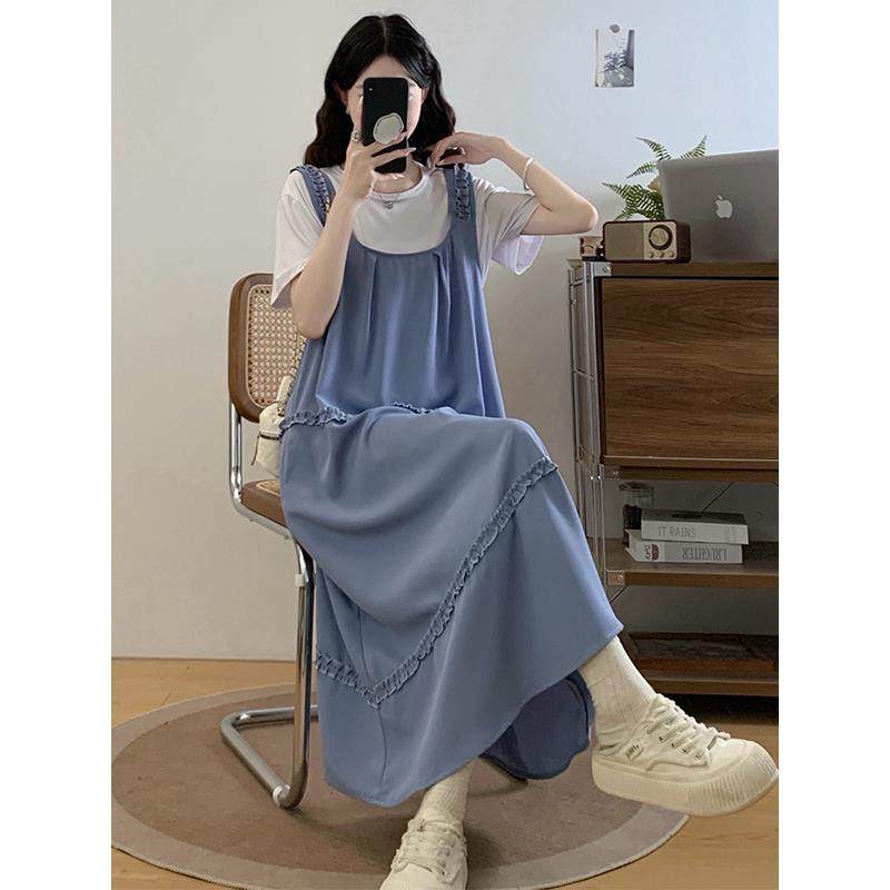 大码减龄休闲套装夏季短袖上衣胖mm遮肚显瘦宽松背带连衣裙两件套