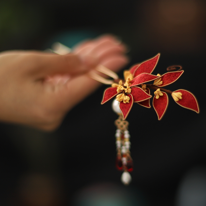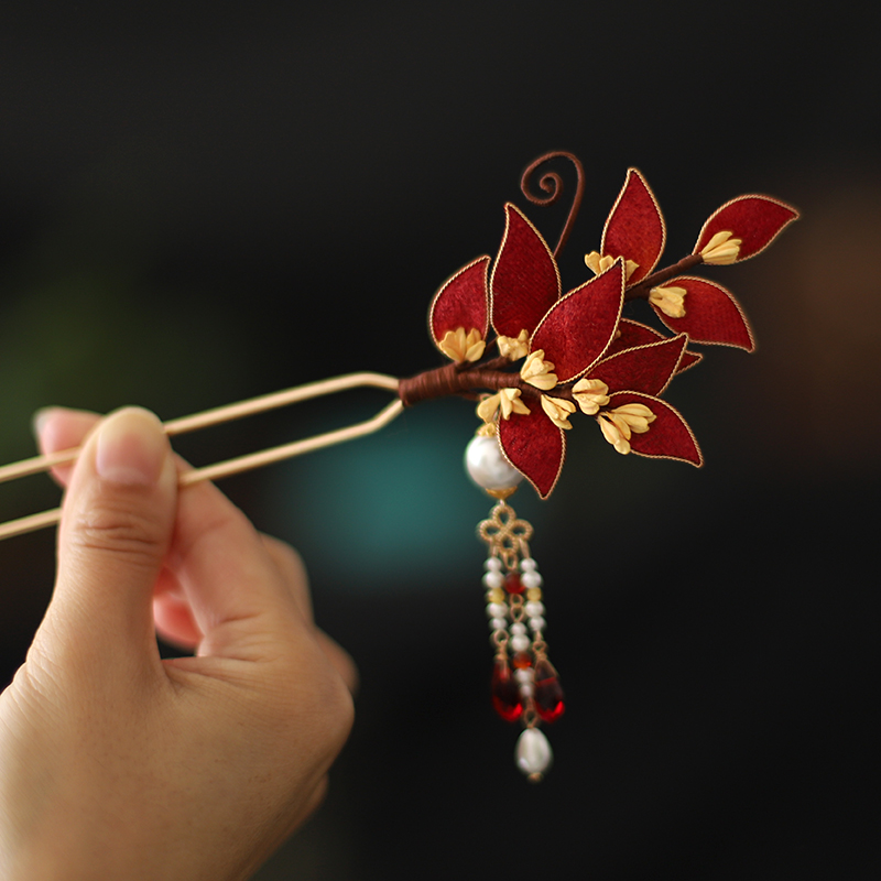 红色桂花流苏u型发簪发钗古风汉服头饰旗袍配饰新娘秀禾订婚发饰