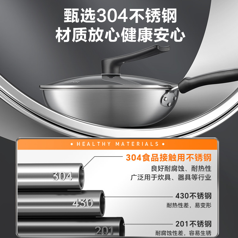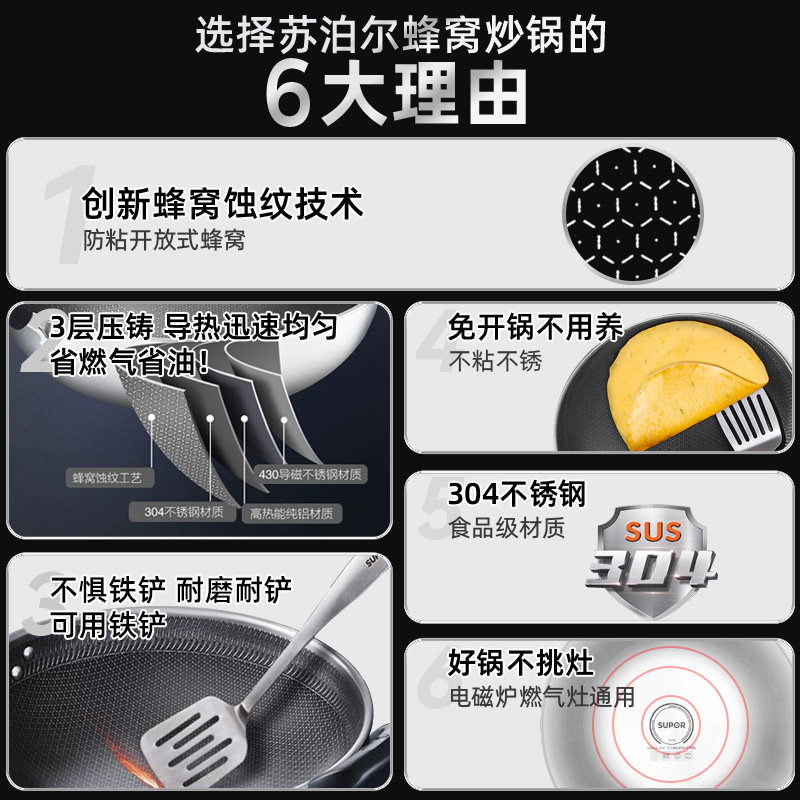 苏泊尔不粘锅家用炒锅304不锈钢不粘炒菜锅蜂窝电磁炉燃气灶通用