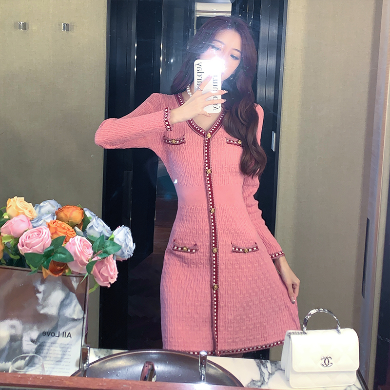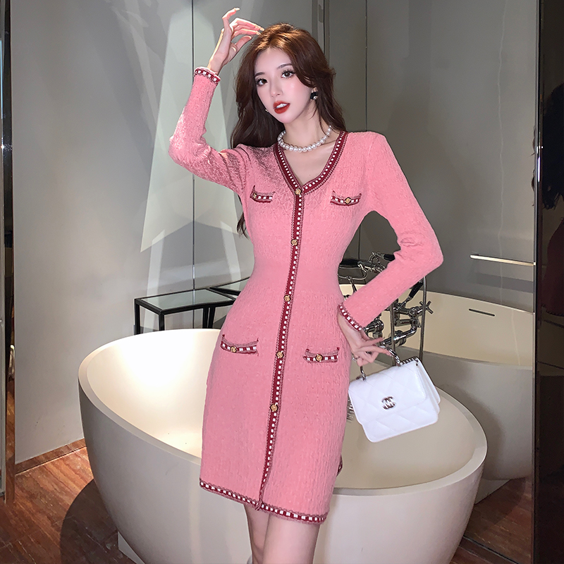 实拍小香风粉色针织连衣裙女秋冬气质小个子内搭修身打底裙子