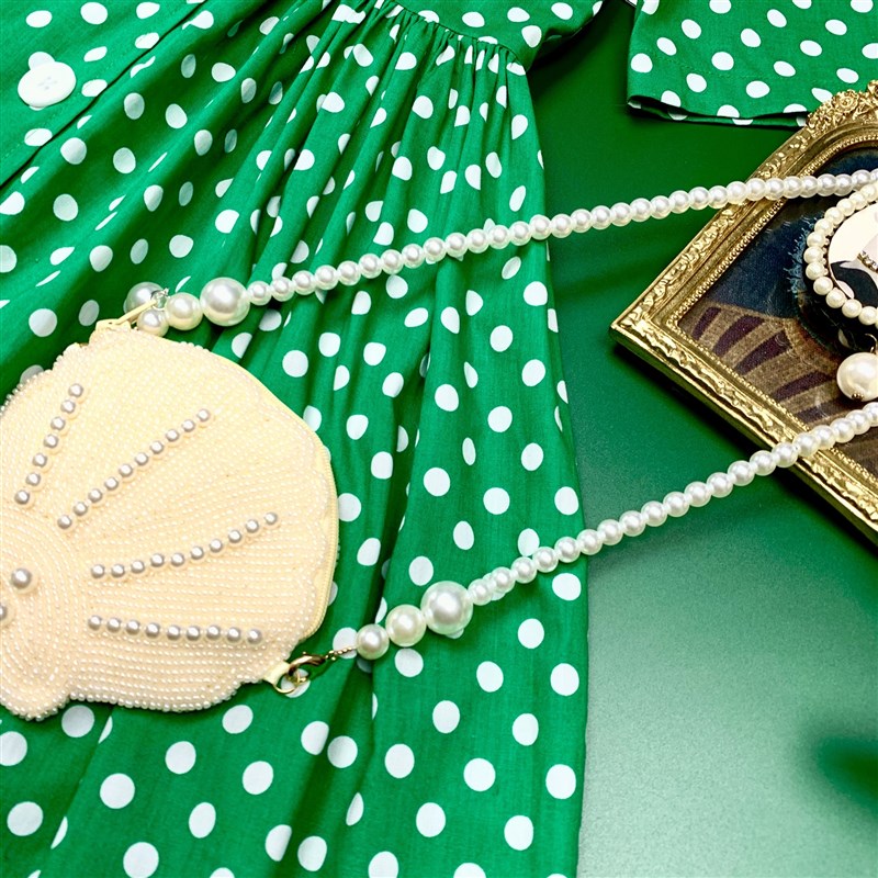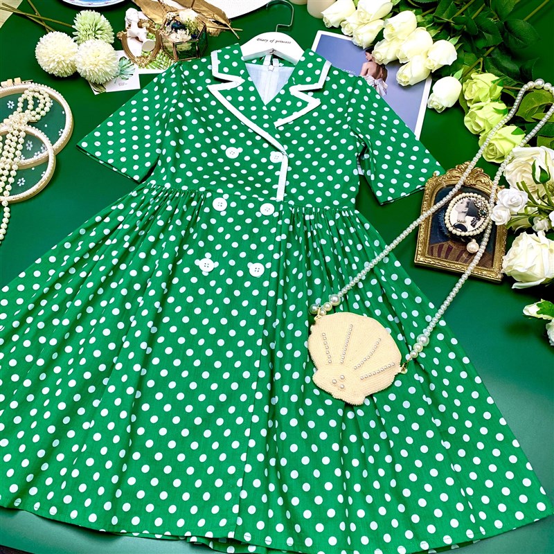 童装女童夏装连衣裙短袖纯棉波点绿色复古裙子英伦风双排扣蓬蓬裙