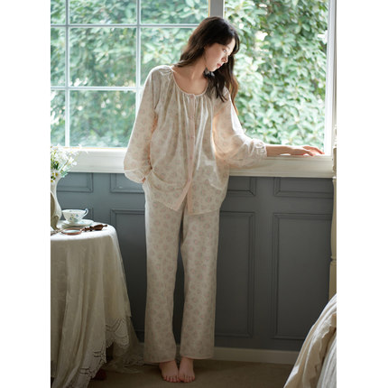 思莉太太睡衣女春秋款莫代尔棉长袖韩系碎花甜美粉色女士家居服