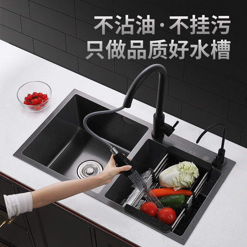 黑色纳米厨房水槽双槽不锈钢手工洗菜盆家用洗碗槽加厚洗菜池台下