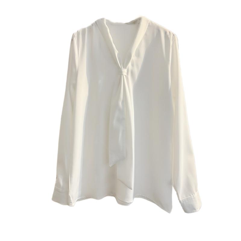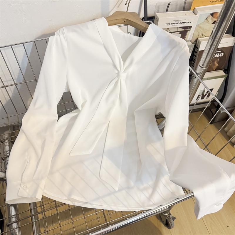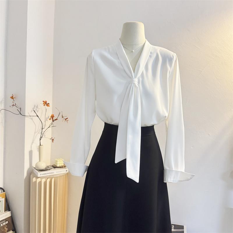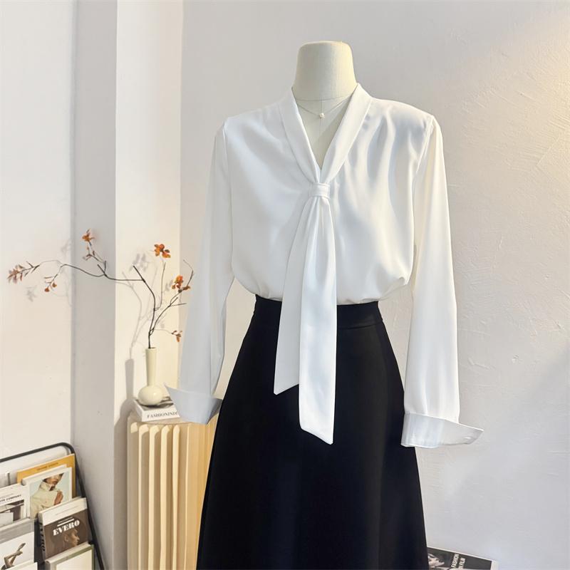 白色法式V领飘带长袖衬衫女2025春宽松简约通勤衬衣垂感小衫上衣