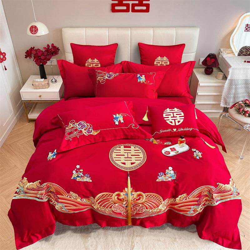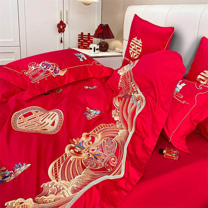 高档中式龙凤刺绣四件套大红色床笠床单被套陪嫁结婚婚庆床上用品