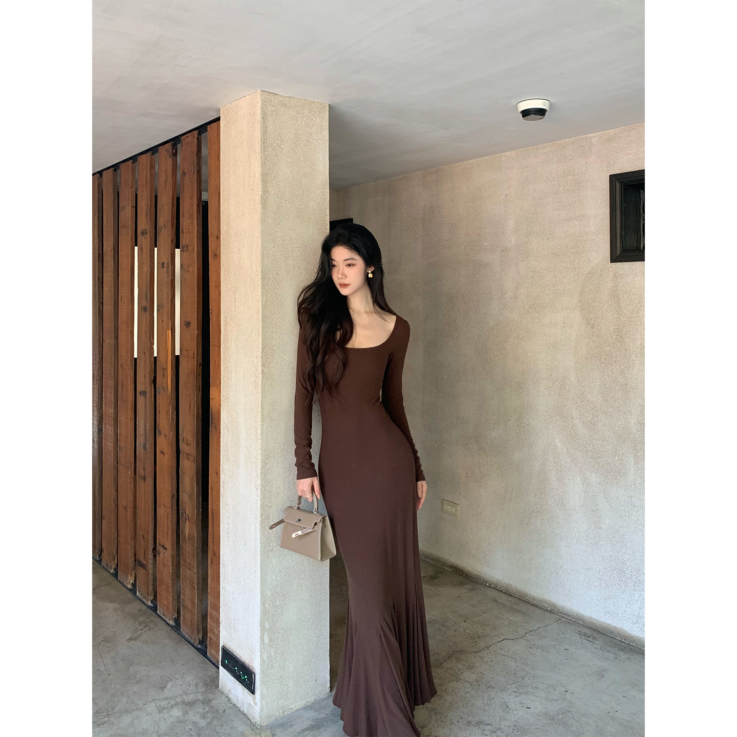 Norain不下雨 步步生莲棕色长袖连衣裙女秋冬修身显瘦打底针织裙