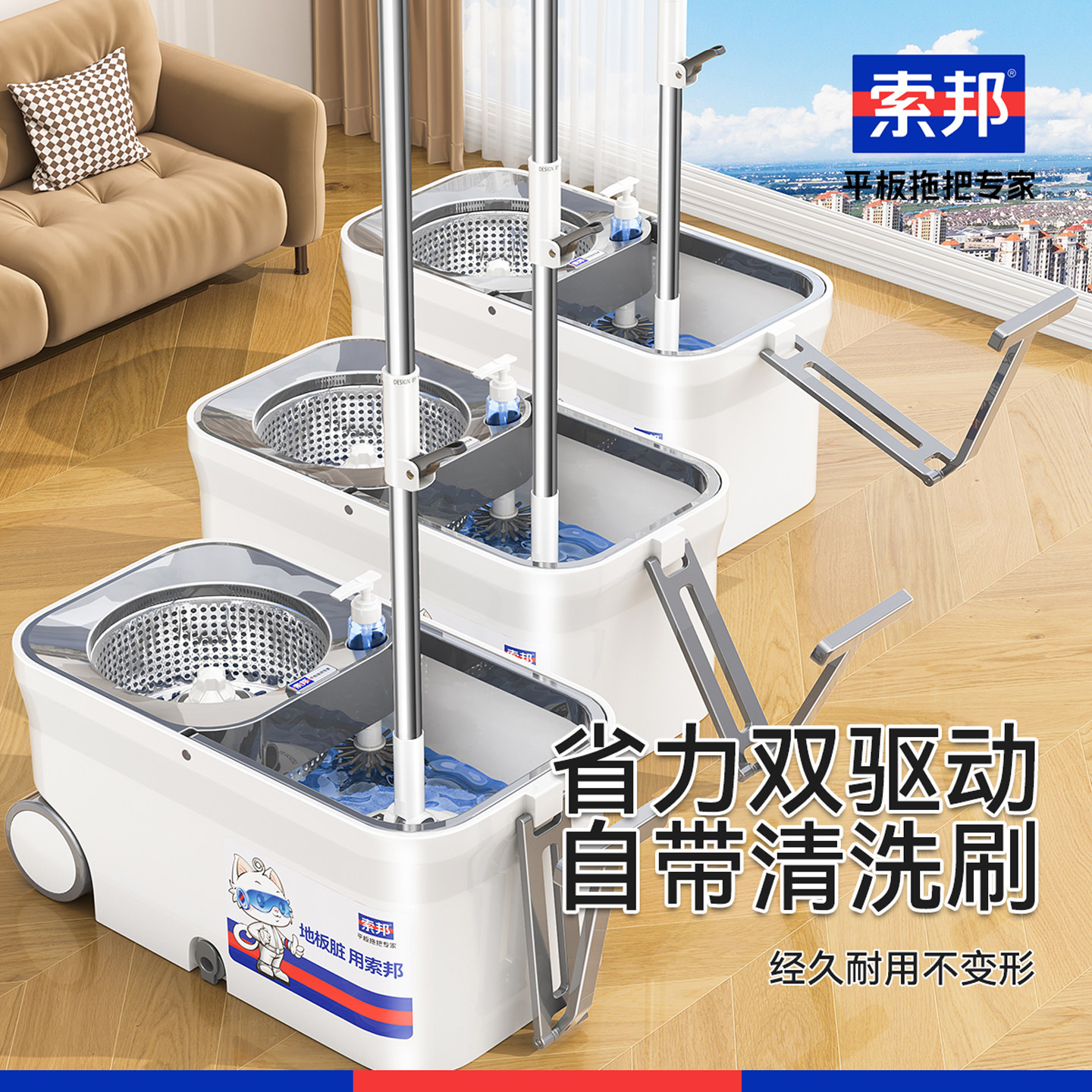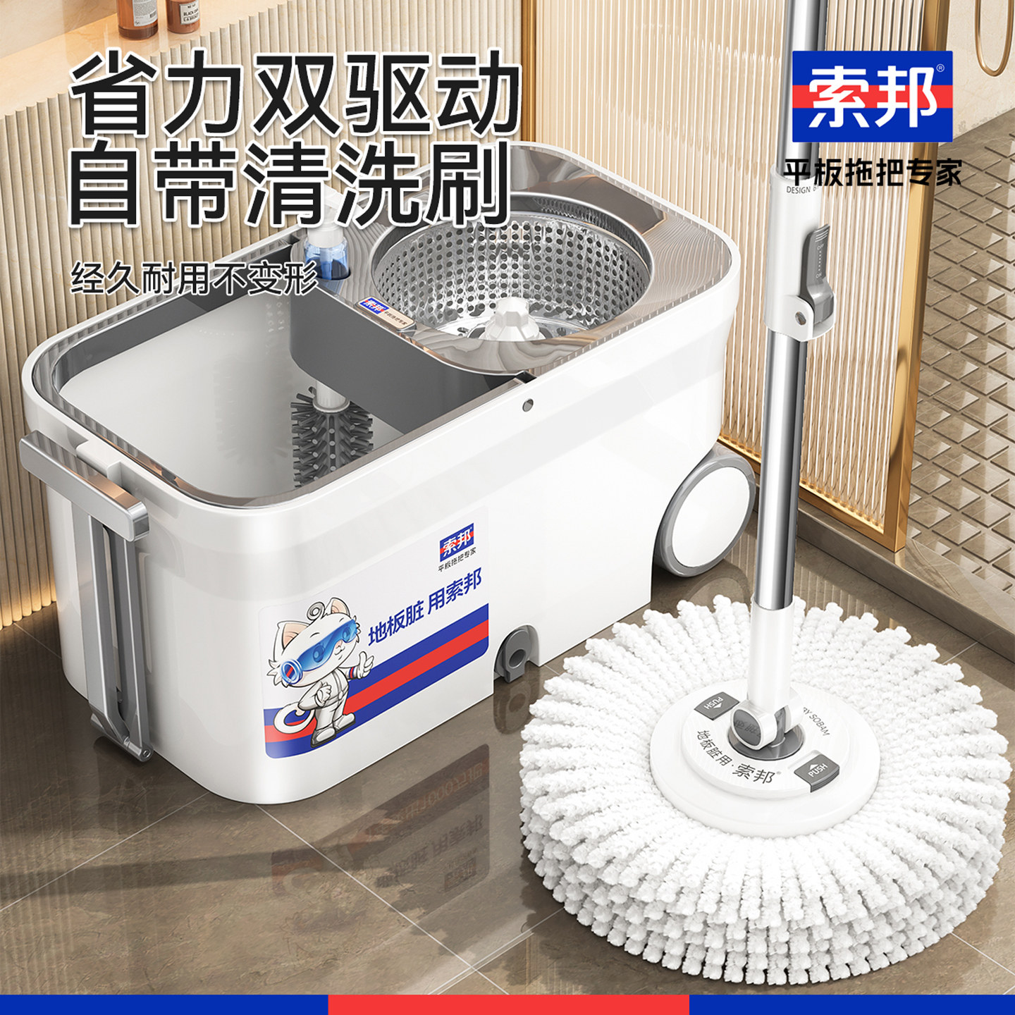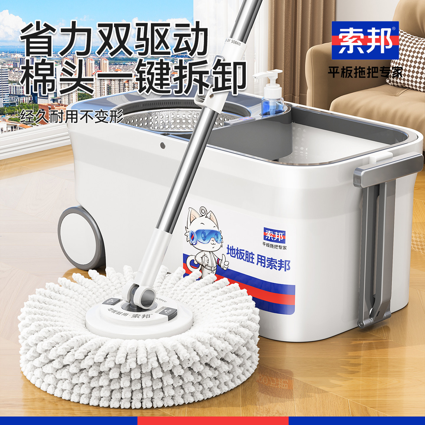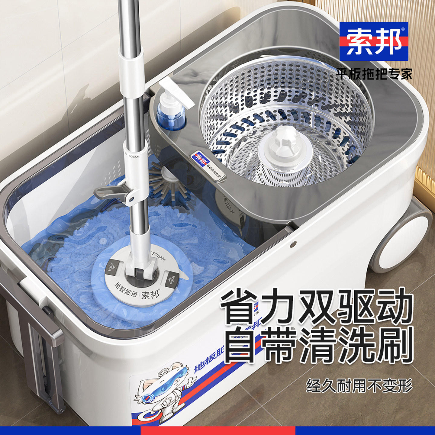 索邦2025新款懒人拖地神器旋转拖把干湿两用带脱水桶免手洗自拧水