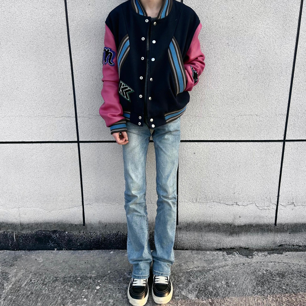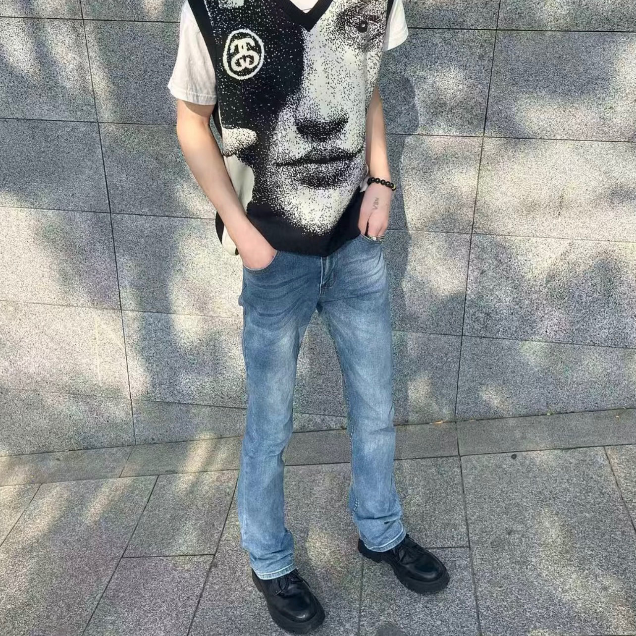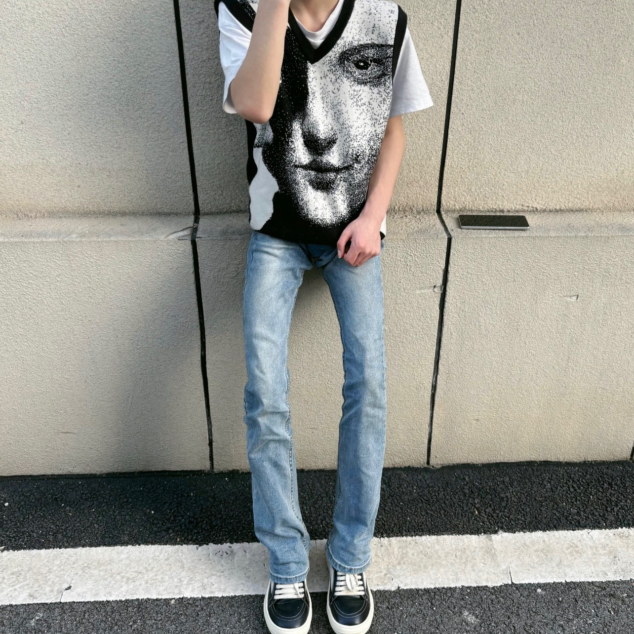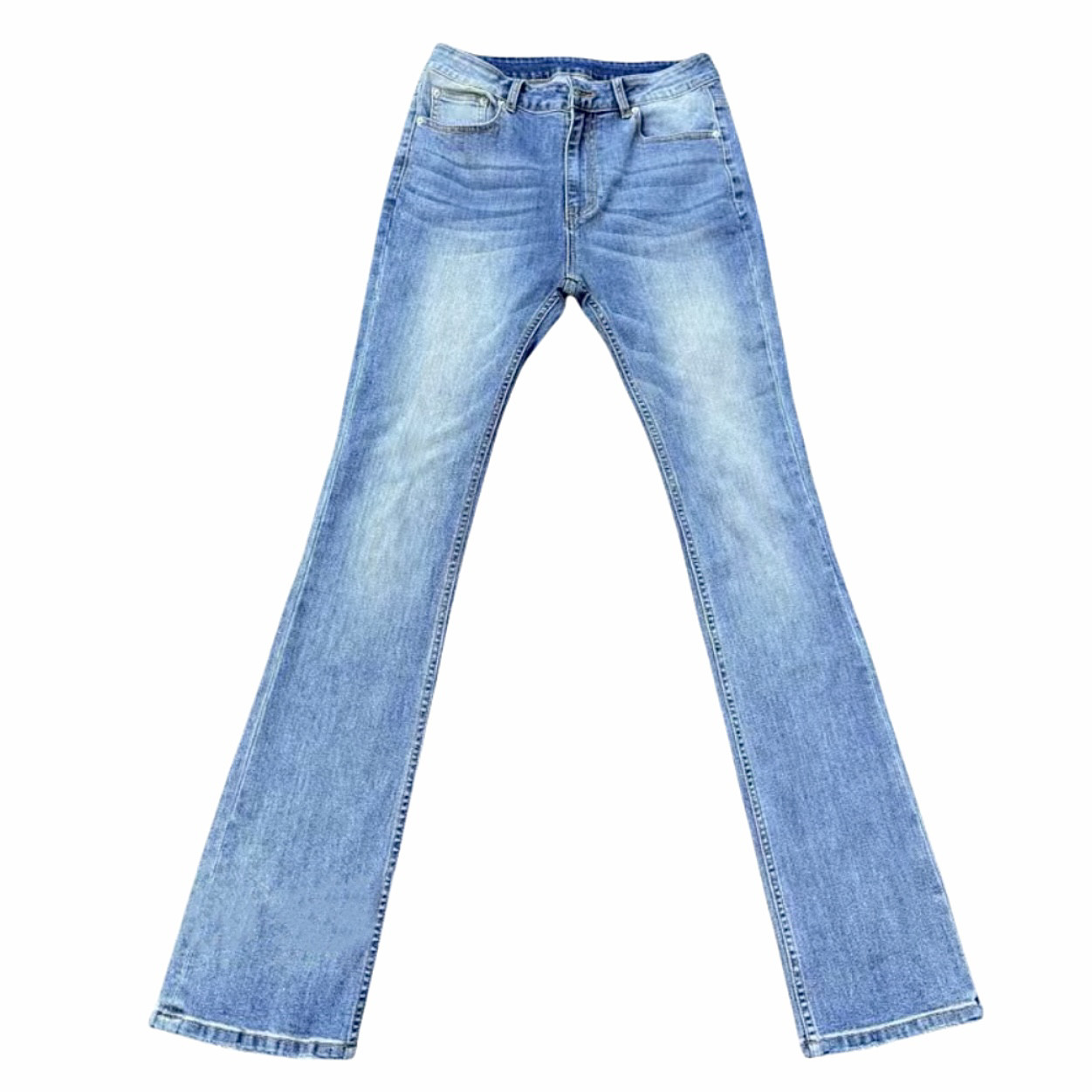 美式复古水洗蓝色小脚磨破设计弹力微喇牛仔裤Cleanfit拖地裤子男