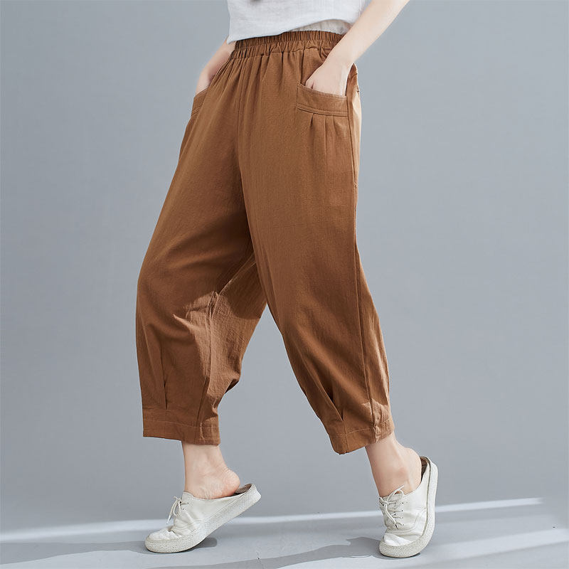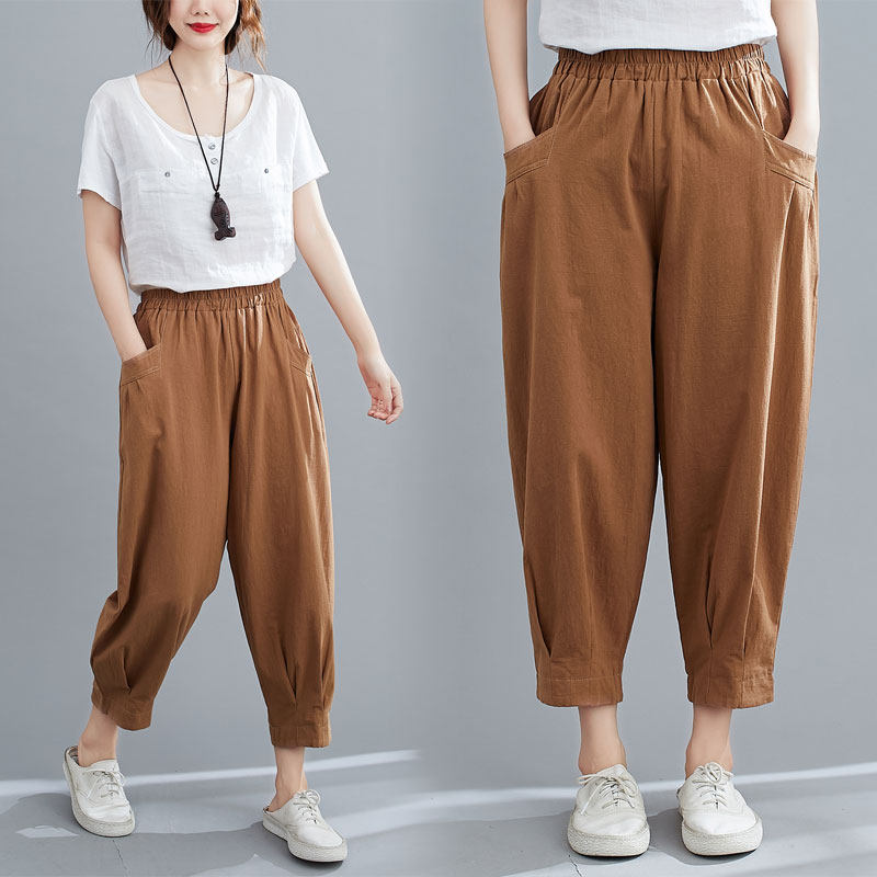 棉麻哈伦裤女2024年夏季新款大码女裤显瘦百搭宽松休闲七分萝卜裤