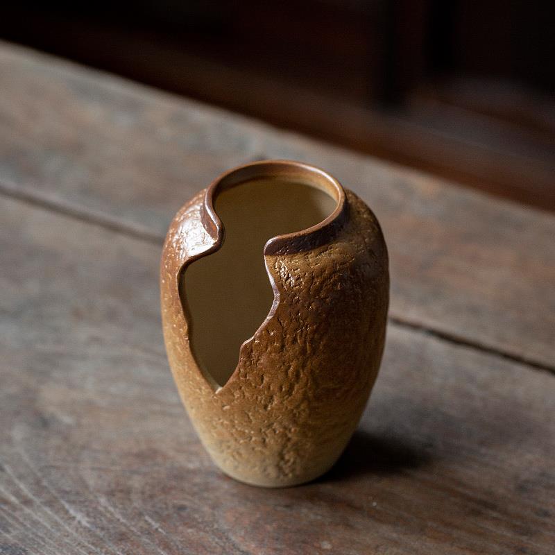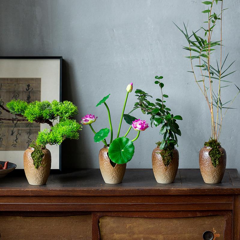 碌心 家用桌面客厅插花器摆件 中式复古柴棕釉绿植花瓶粗陶小花器