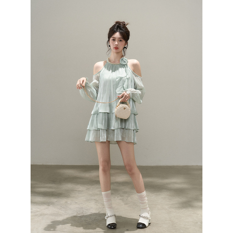 法式富家千金风露肩挂脖连衣裙女早秋新款气质小香风蛋糕长袖裙子