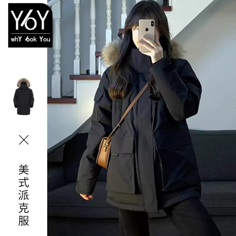 情侣工装羽绒棉服女时尚休闲新款中长款大毛领加厚派克服冬季外套