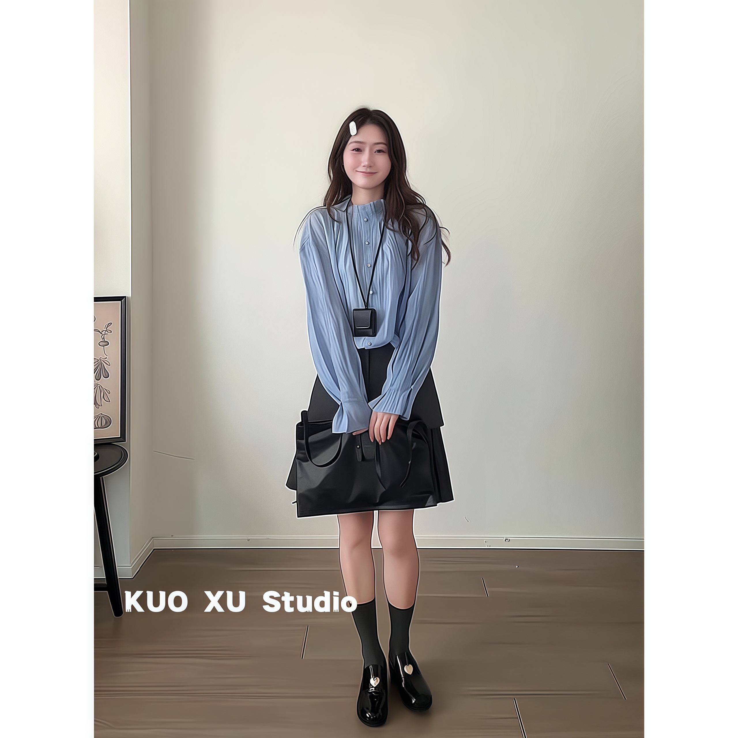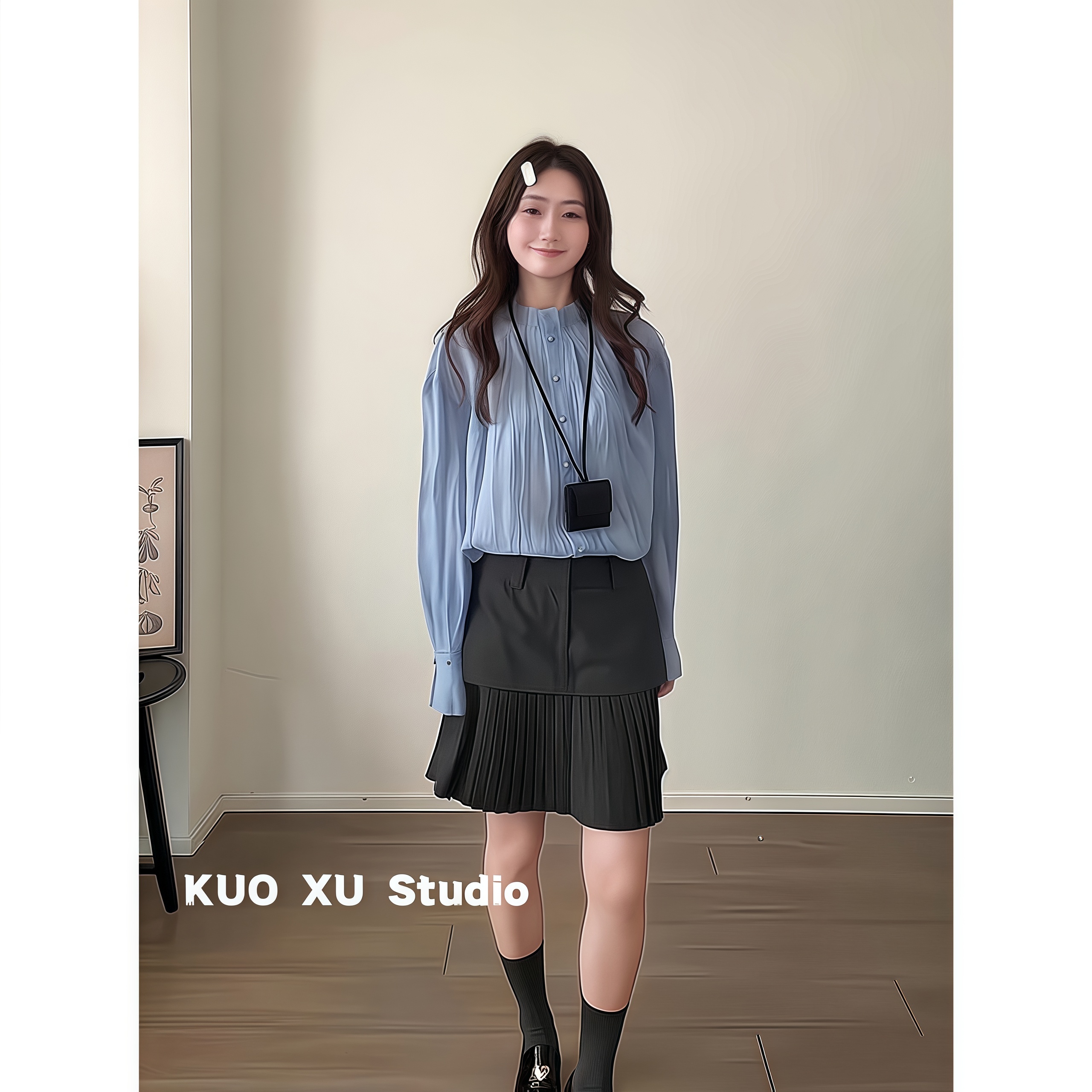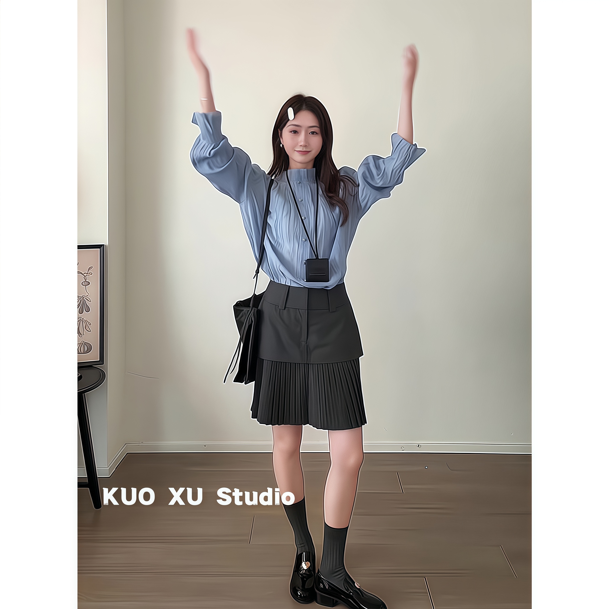 法式立领通勤宽松衬衫灯笼长袖衬衣格纹拼接百褶半身裙短裙套装女
