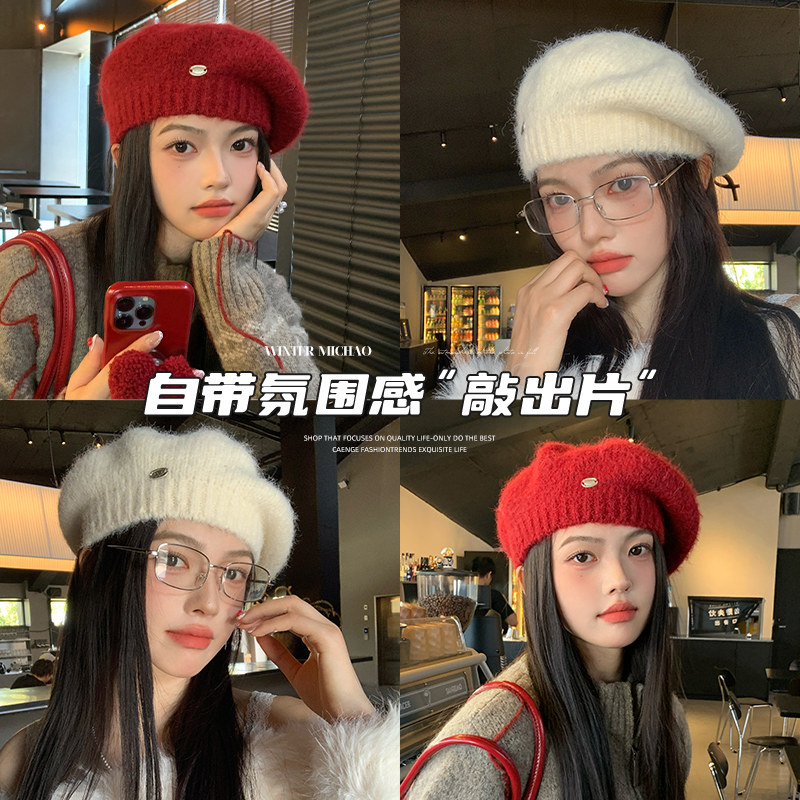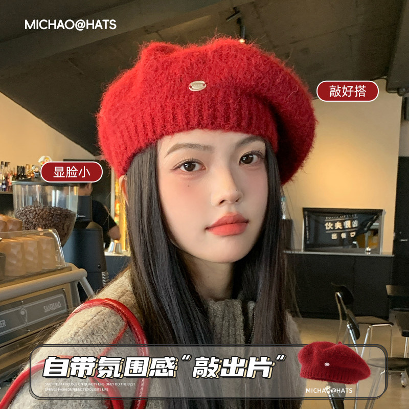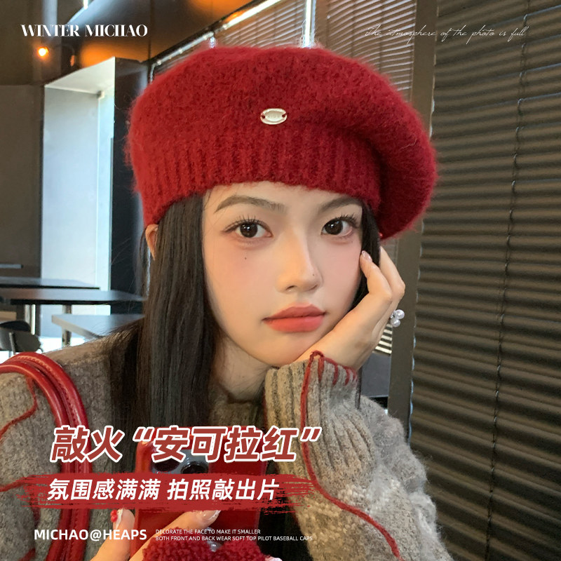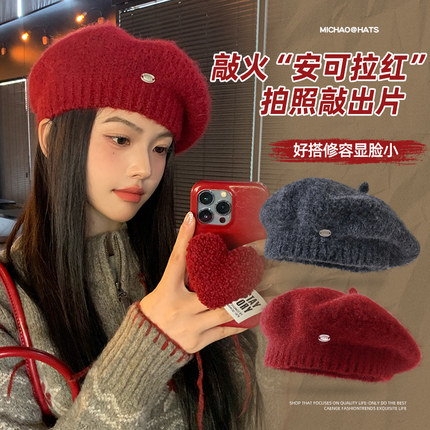 安可拉红色贝雷帽女2024新款羊毛针织毛线帽显脸小秋冬保暖画家帽