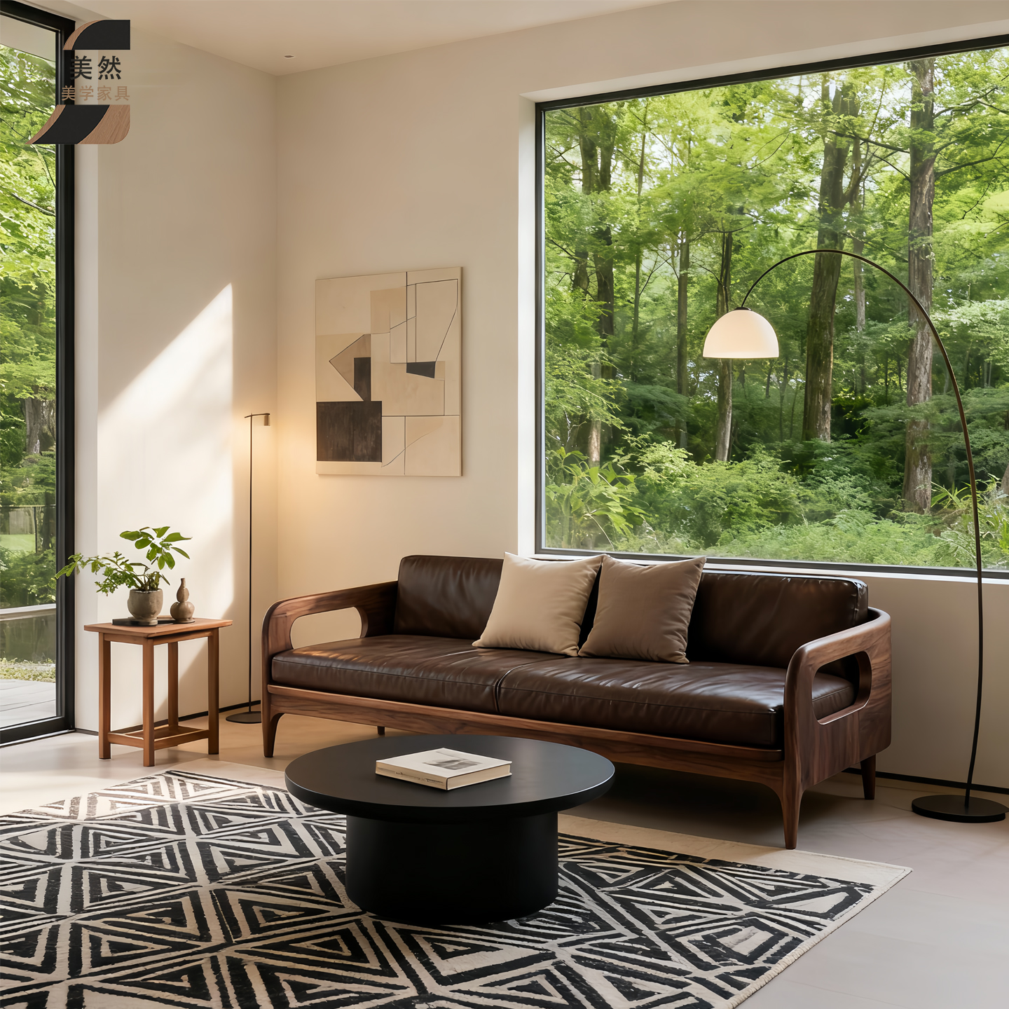新中式北美黑胡桃木沙发中古风高端实木现代简约客厅真皮直排沙发