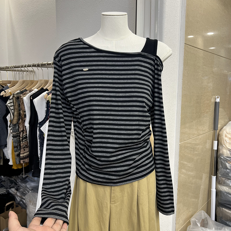 韩系早秋新款时尚斜肩条纹长袖T恤女洋气宽松显瘦百搭休闲上衣女