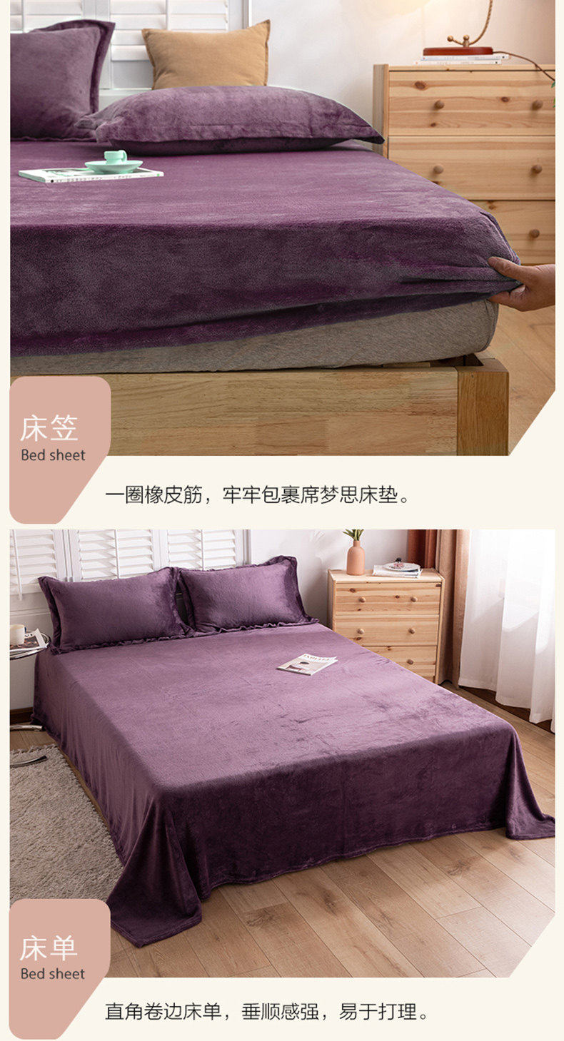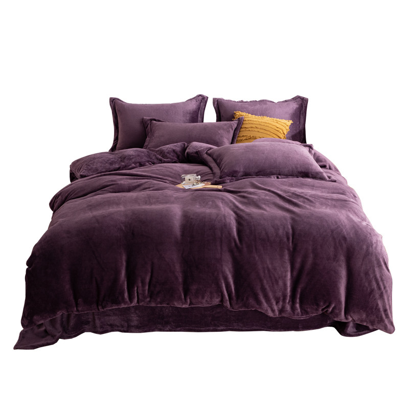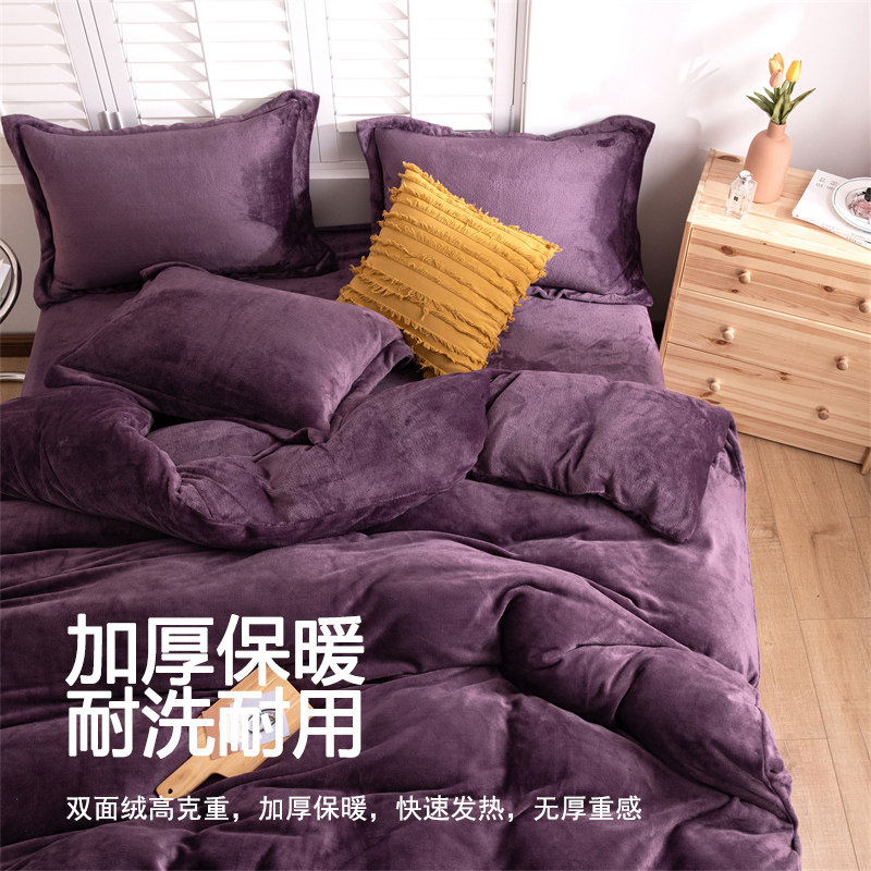 牛奶绒四件套冬款珊瑚绒紫色双面加绒被罩床单笠款加厚保暖三件套