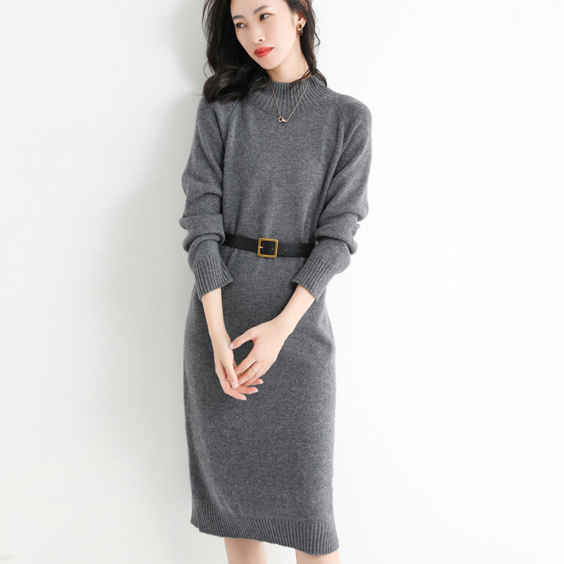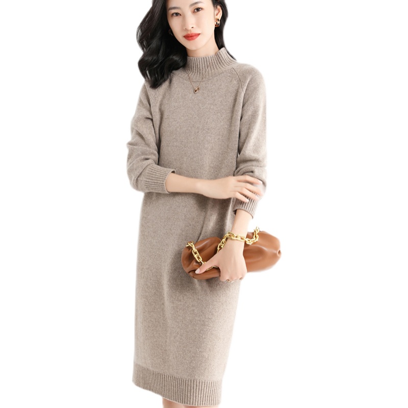 秋冬羊绒衫女连衣裙中长款羊毛衫大码半高领毛衣裙针织过膝打底裙