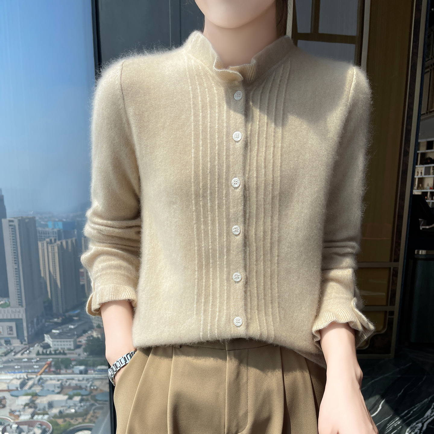 轻奢山羊绒木耳边开衫女25秋季新款纯色气质小衫长袖针织毛衣外套