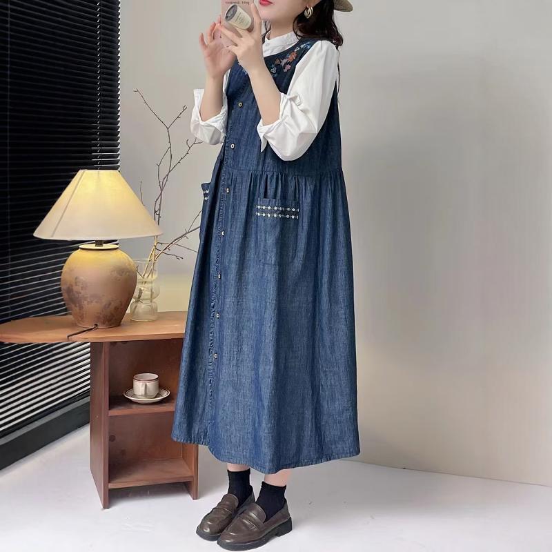 2024秋季新款文艺复古刺绣牛仔背心裙女宽松显瘦无袖连衣裙子