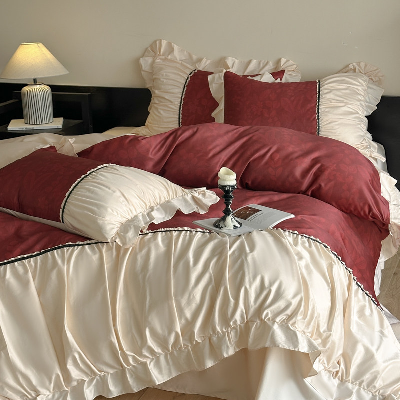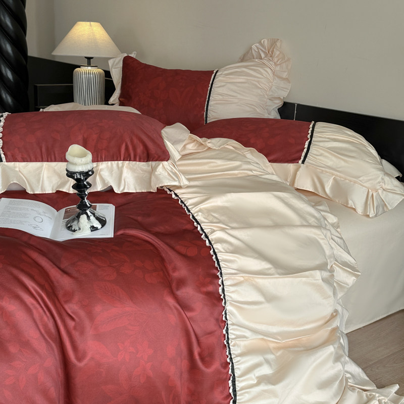 法式花边婚庆四件套A类纯棉120支长绒棉提花被套红色结婚床单床品