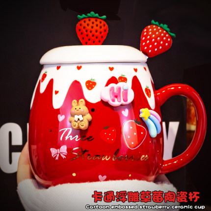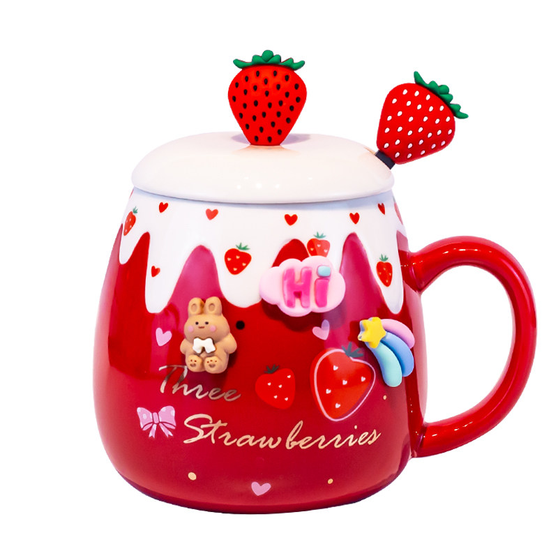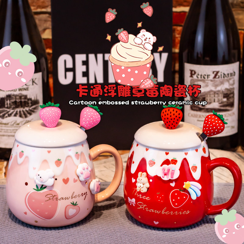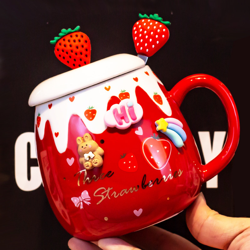 草莓马克杯带盖勺女生陶瓷水杯可爱咖啡红色伴手礼日式创意办公室