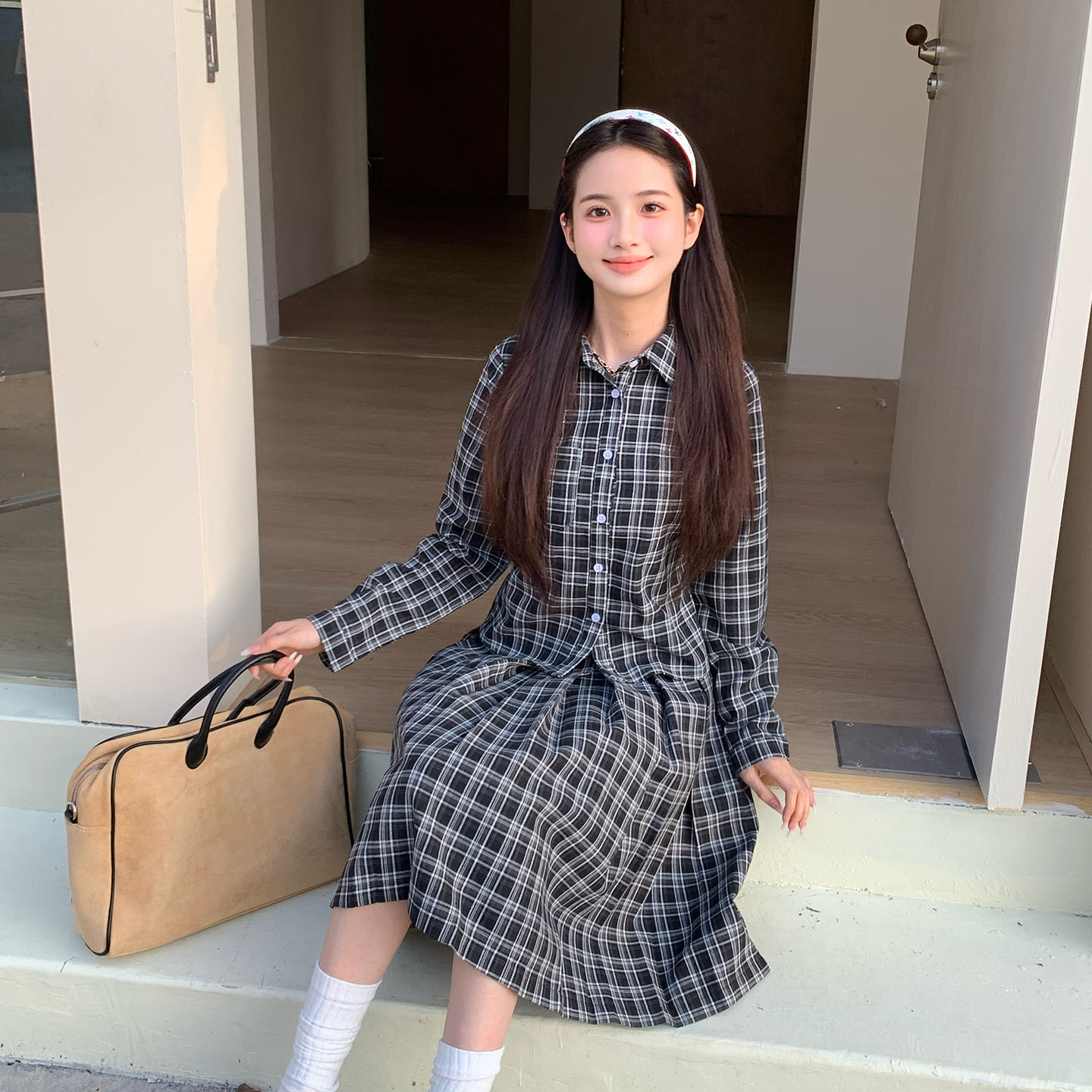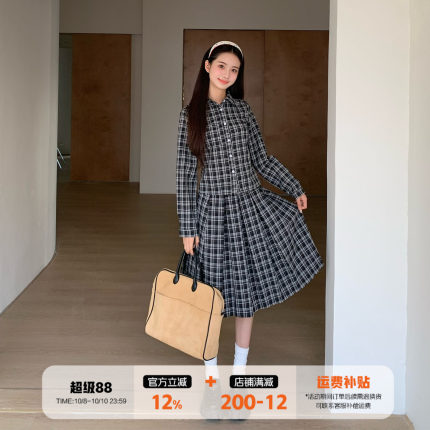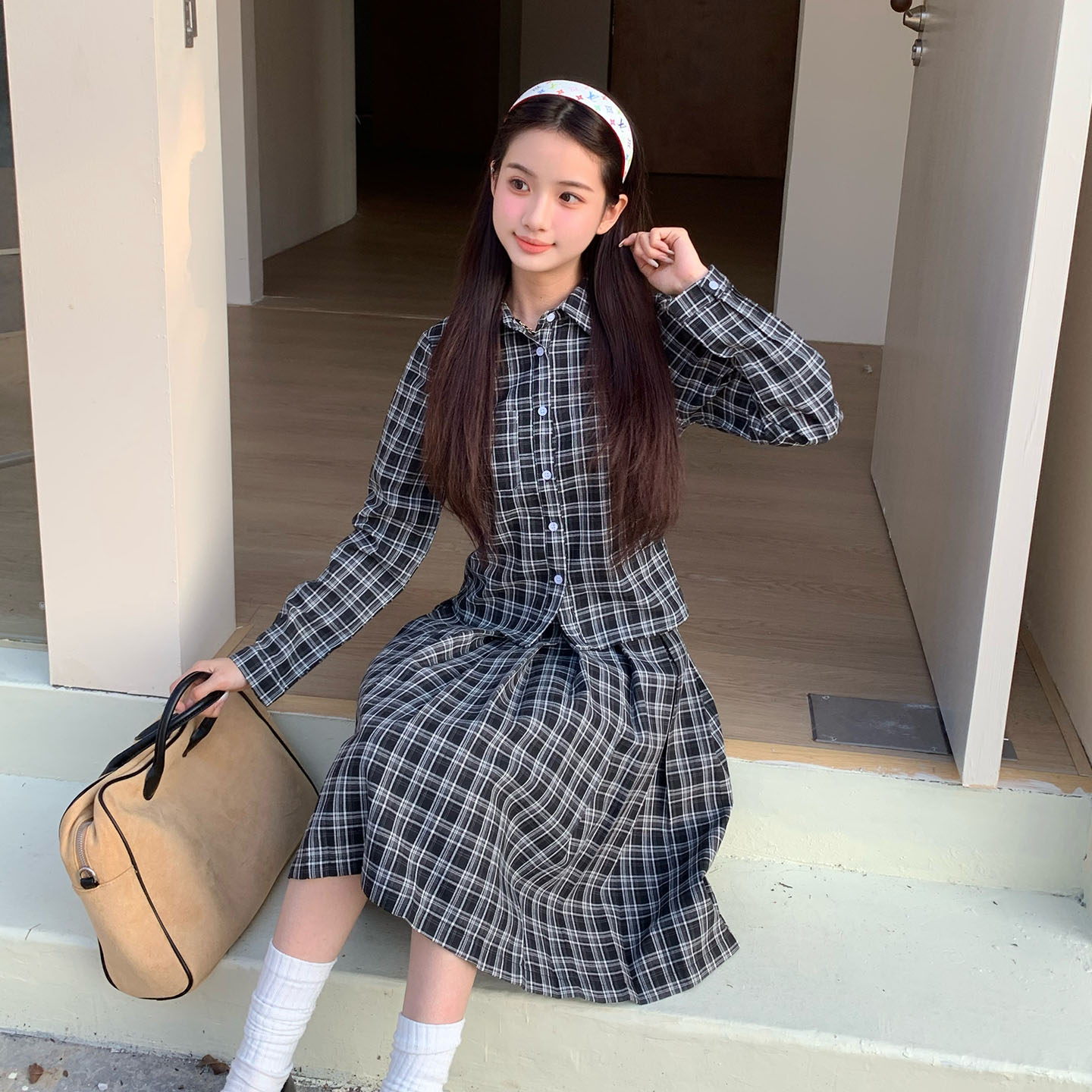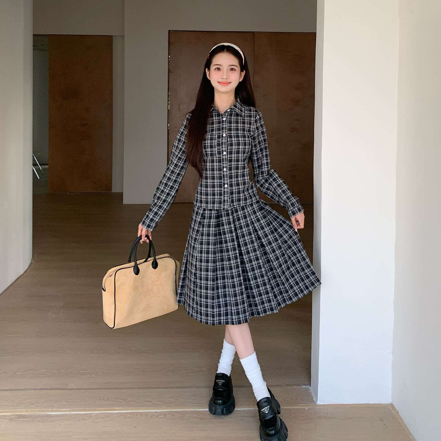 橘子树在哪儿格子套装女秋季显瘦气质polo领衬衫百褶半身裙两件套