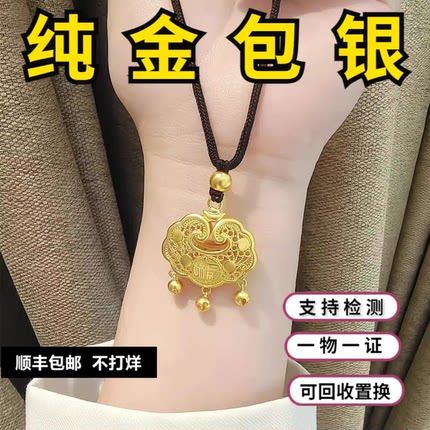 古法金包银福字平安锁吊坠铃铛如意长命锁项链女情人节生日礼物