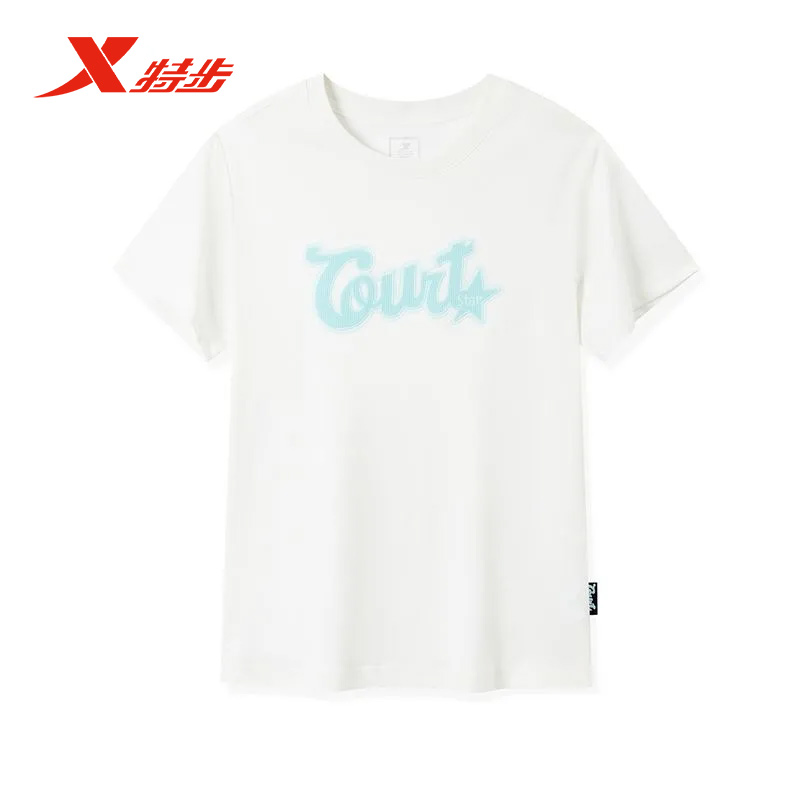 特步短袖T恤女2025秋款新款绣花字母纯棉休闲圆领T恤975328010016