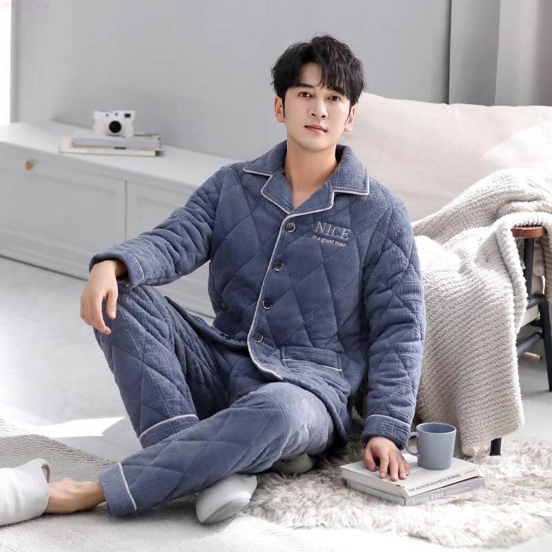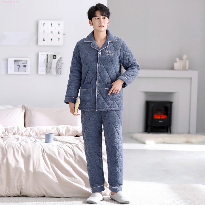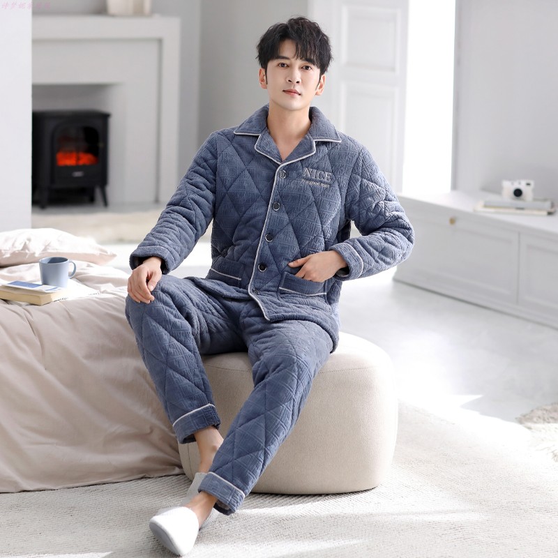 男士睡衣珊瑚绒冬季三层夹棉加厚加绒法兰绒秋冬款保暖家居服套装