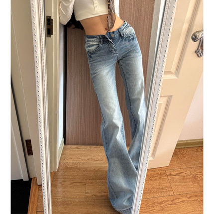 浅蓝色低腰闪电纹不贴腿微喇牛仔裤女2026春季新款美式直筒喇叭裤