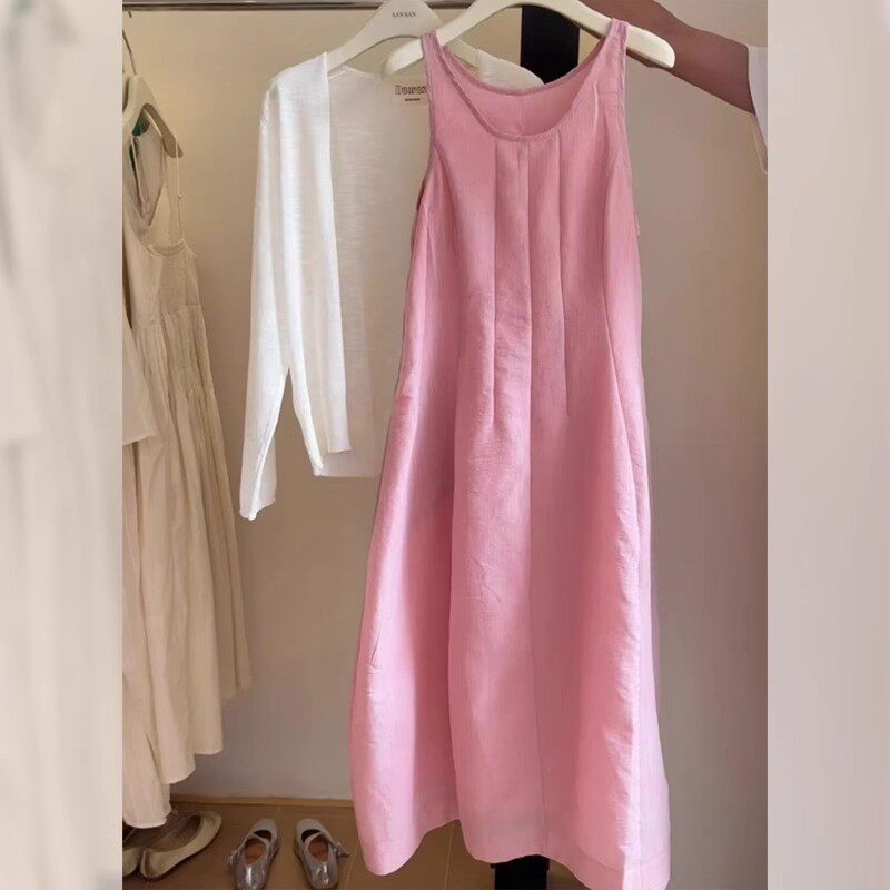 清仓捡漏~专柜撤回外贸女装高端弛感穿搭粉色亚麻背心连衣裙夏