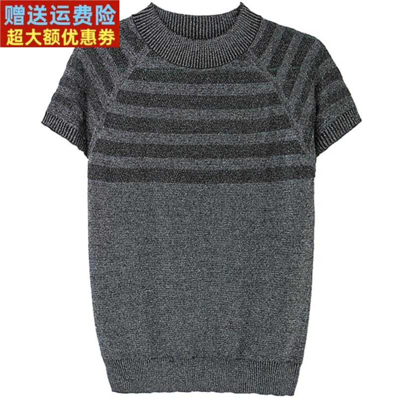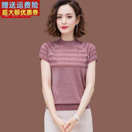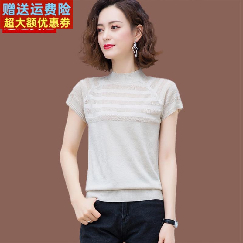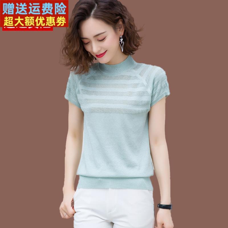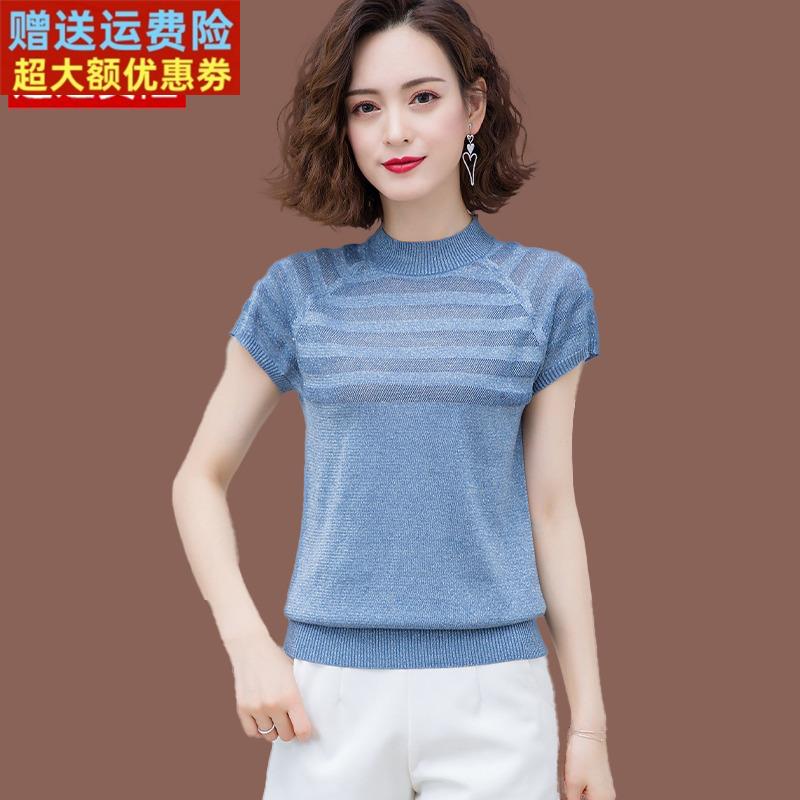 桑蚕丝短袖t恤女上衣夏季新款气质短款镂空薄款亮丝冰丝针织小衫