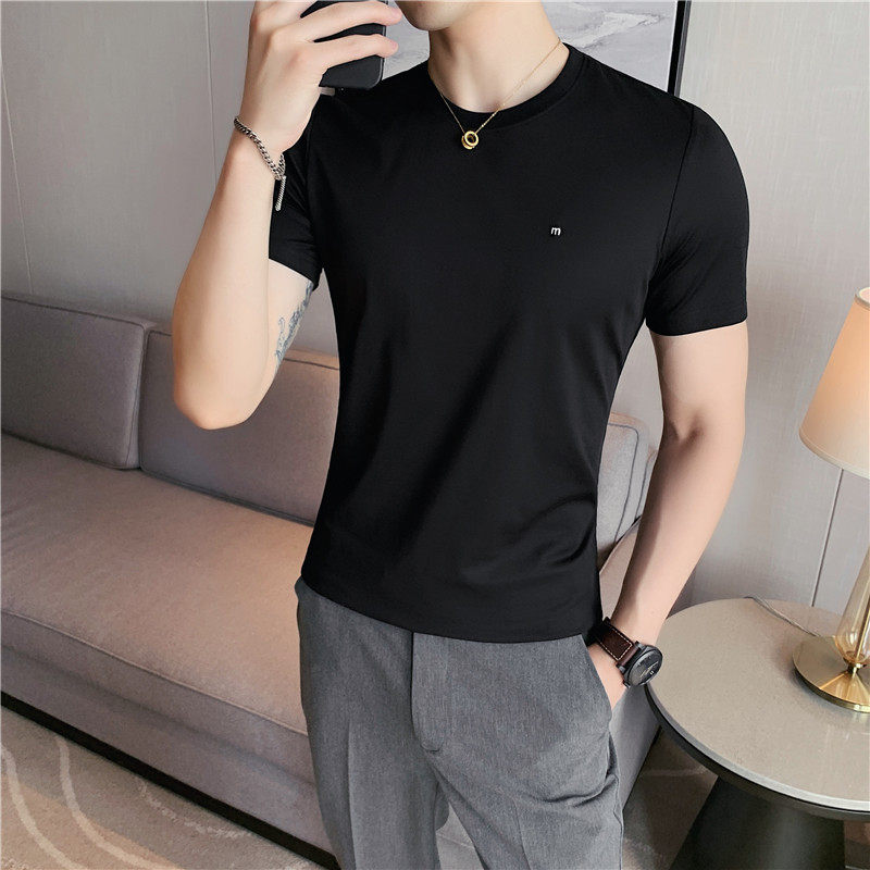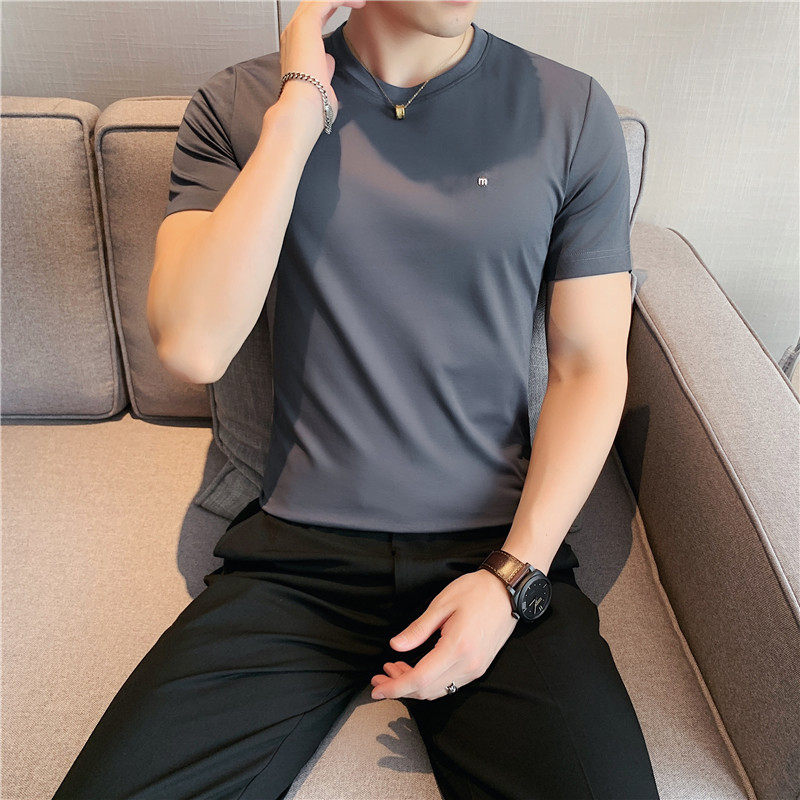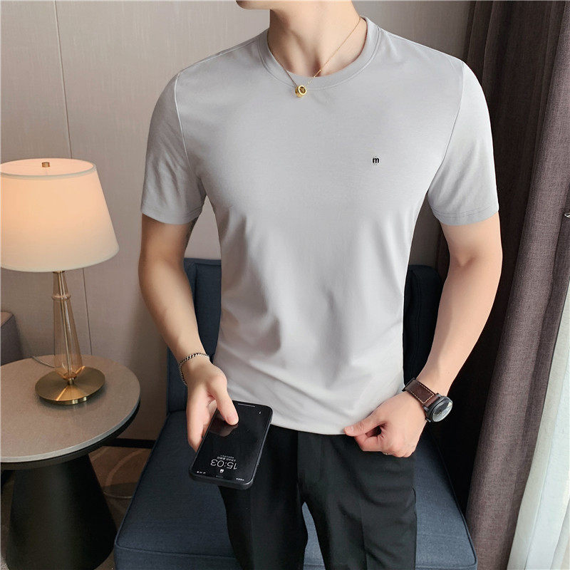 男装夏季薄款男士圆领短袖T恤半袖丝光棉冰丝刺绣弹力纯棉体恤衫