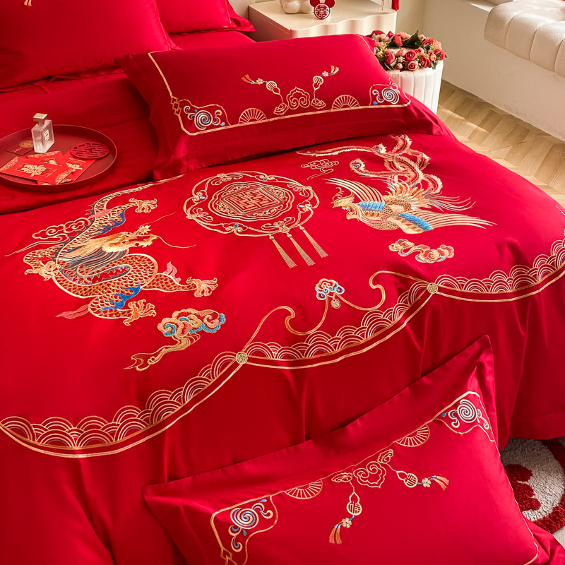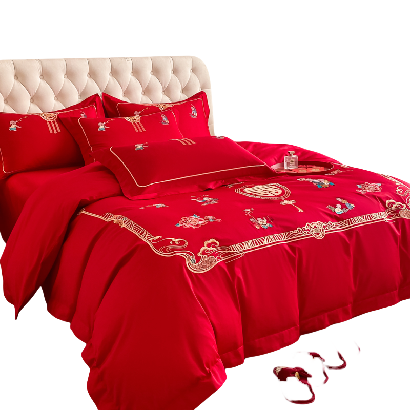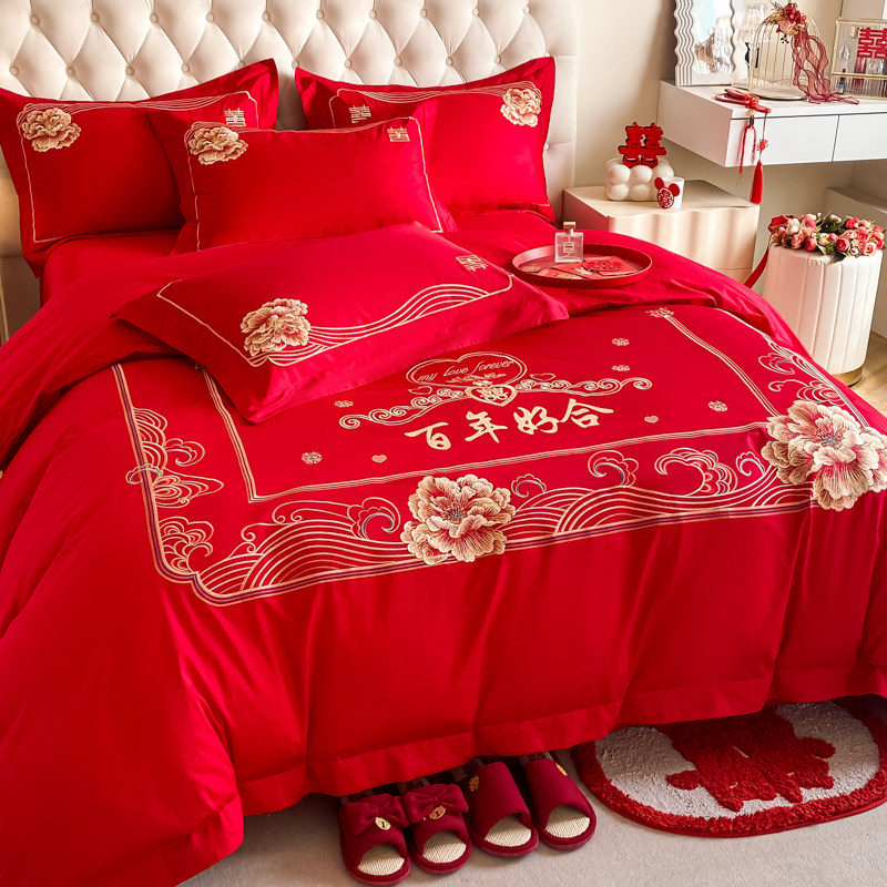 高档中式百子图结婚四件套大红色床单被套纯棉新婚庆床上用品婚房