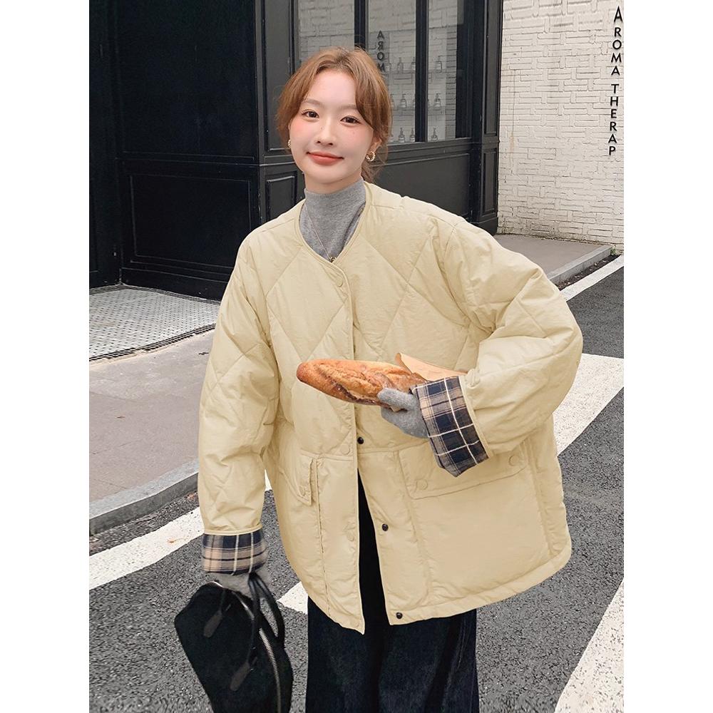 冬季155cm矮个子娇小搭配XXXS女装圆领格子拼接棉服轻薄短款棉袄