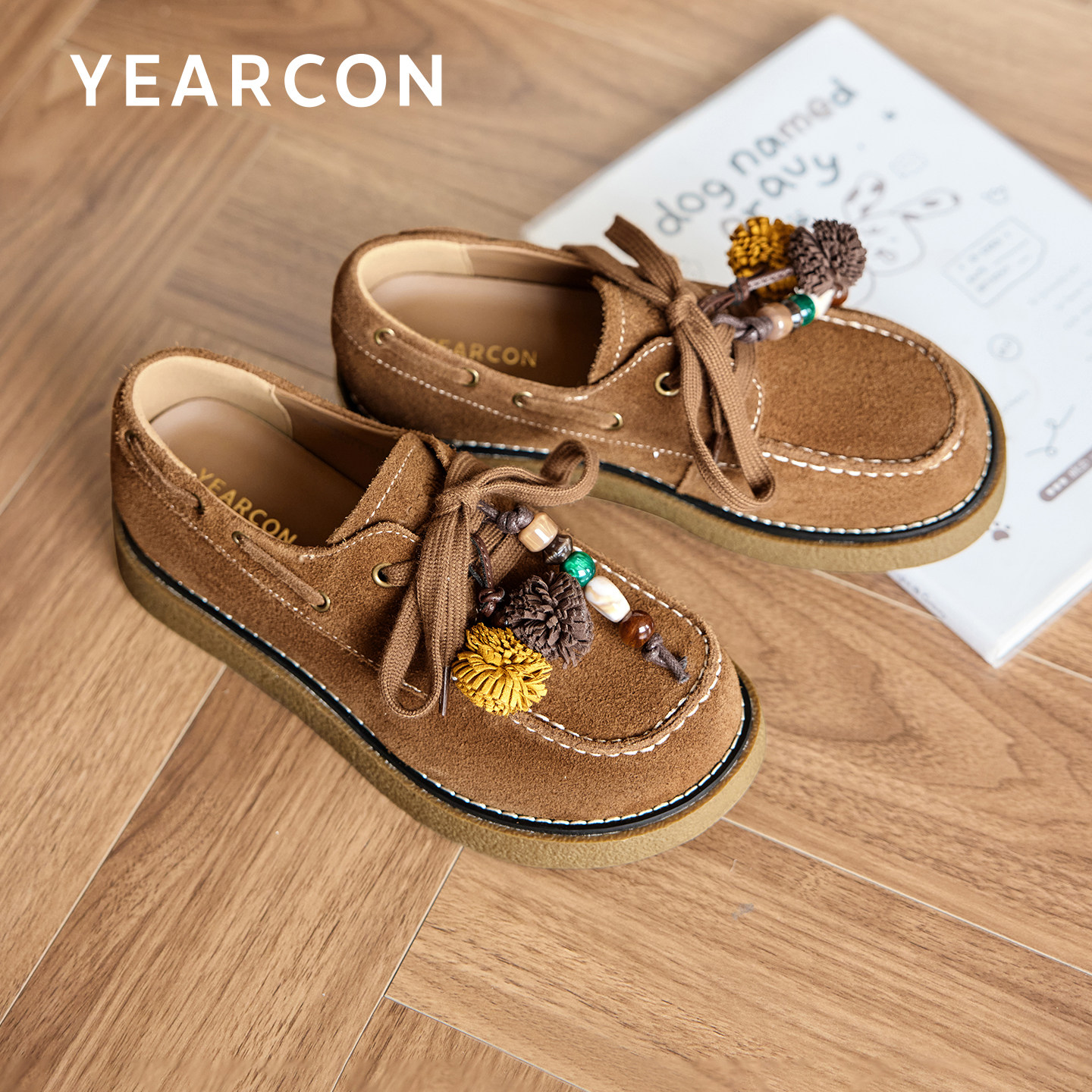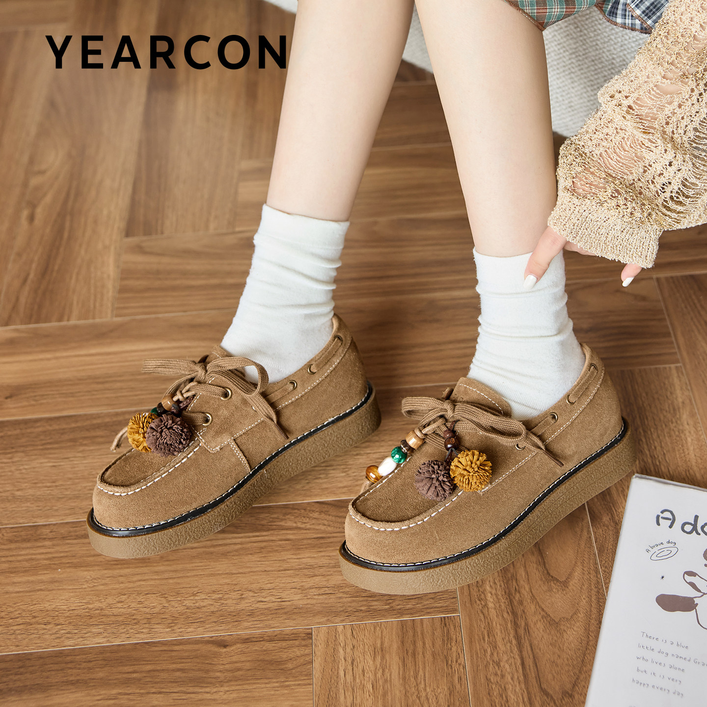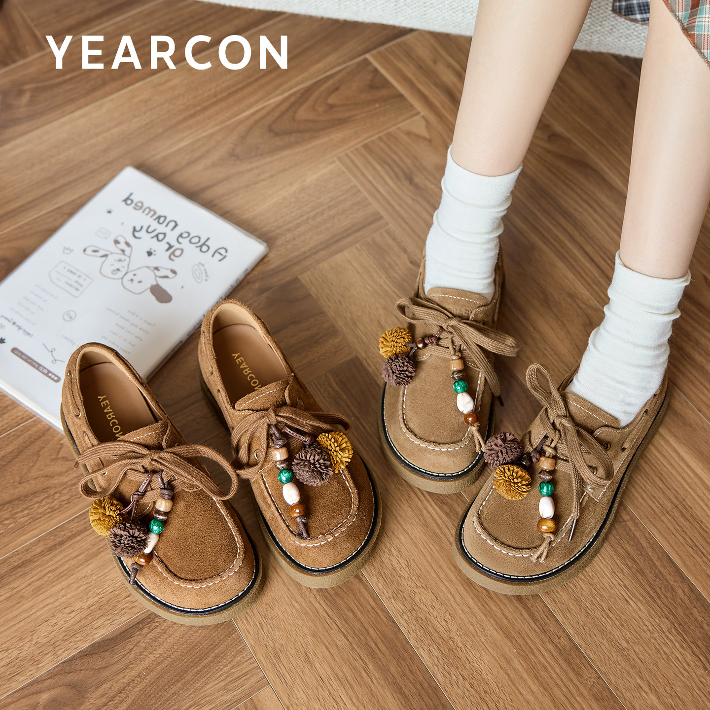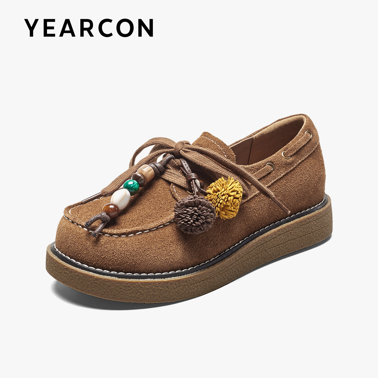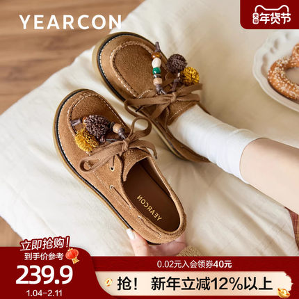 意尔康真皮袋鼠鞋女2026春秋款休闲厚底勃肯鞋设计感串珠乐福鞋