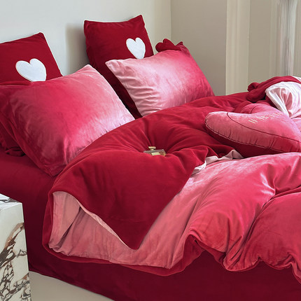 少女心牛奶绒结婚四件套冬款渐变色加厚珊瑚绒被套红色法兰绒床品