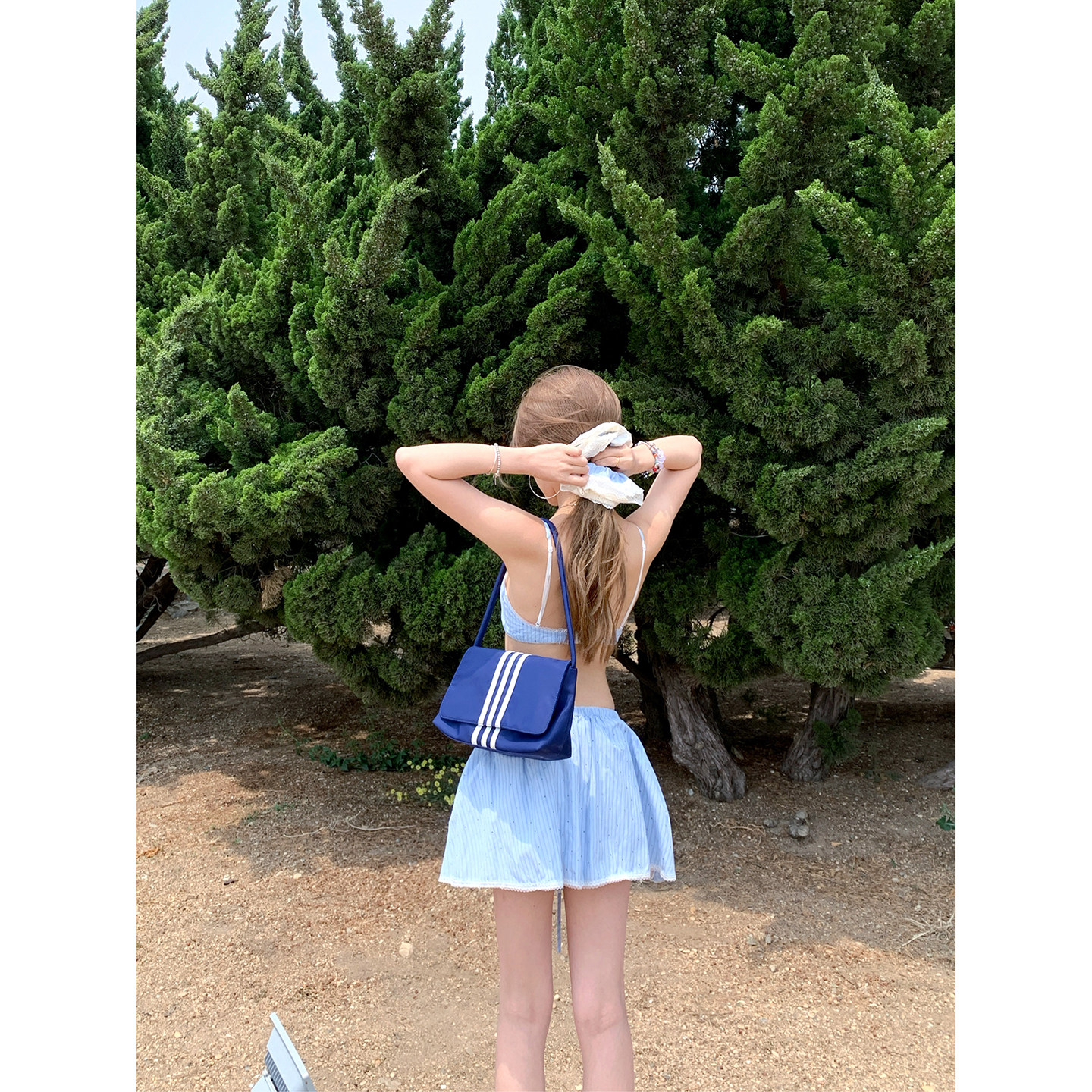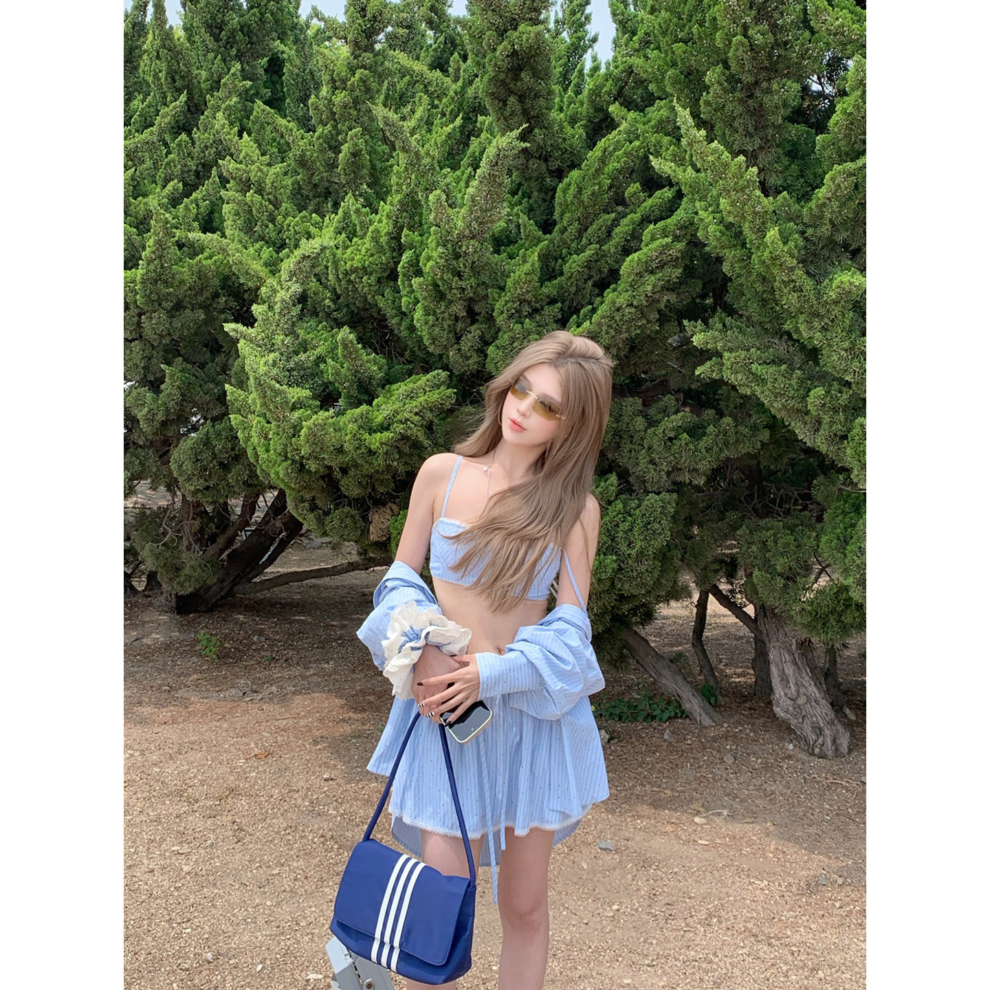 CAFE ROSE 时尚套装女夏季新款条纹吊带短款背心短裤长袖衬衫发圈