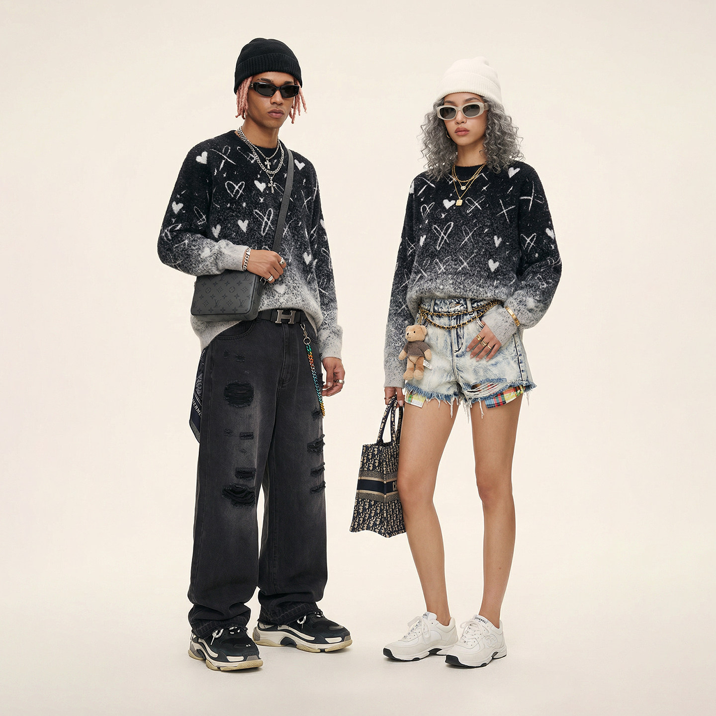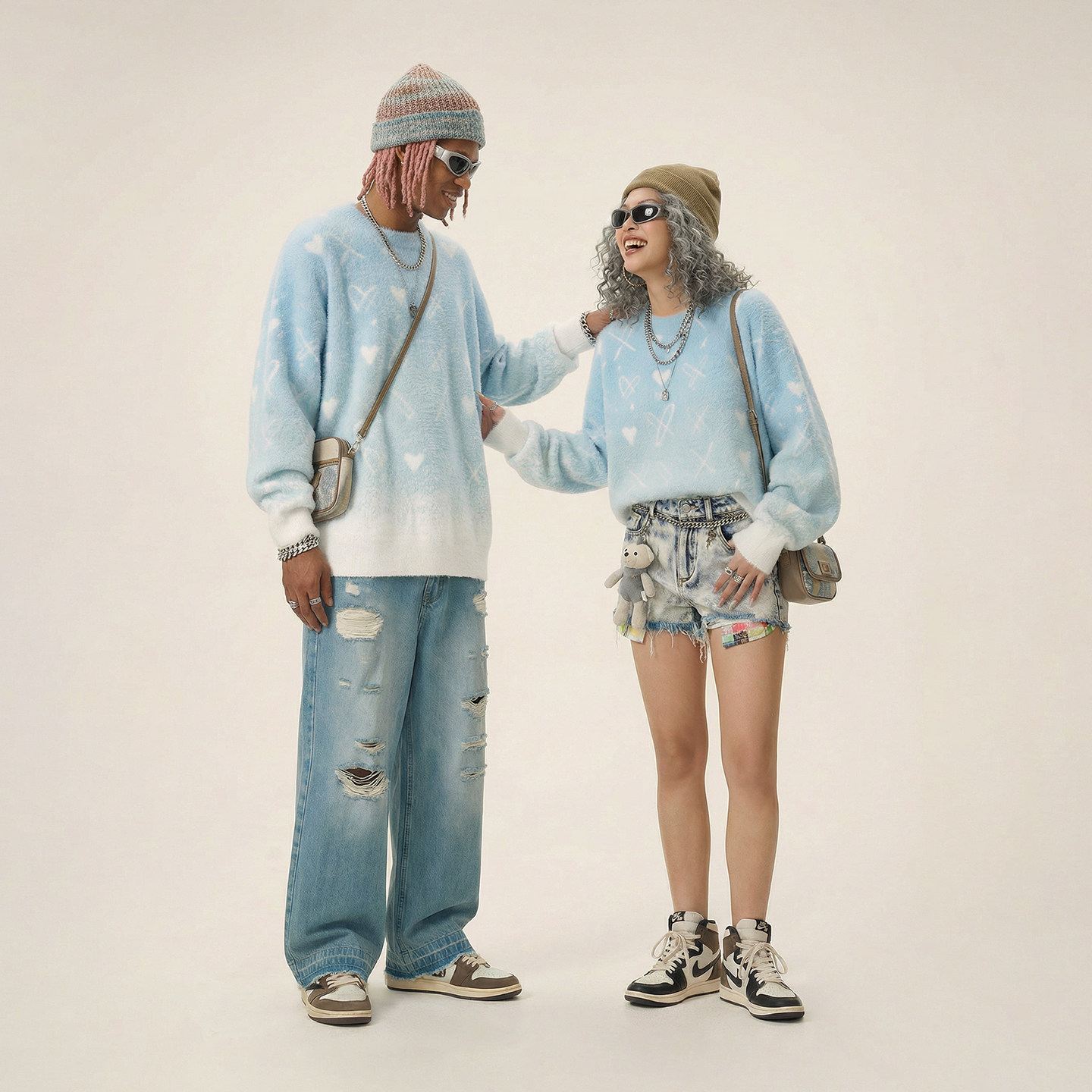 明星同款 INXX仿貂毛渐变圆领针织衫宽松慵懒感秋季情侣款毛衣