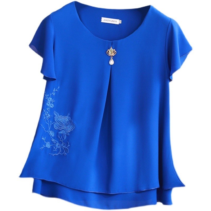 妈妈短袖T恤圆领雪纺绣花小衫夏季中老年女装阔太太宽松遮肚上衣